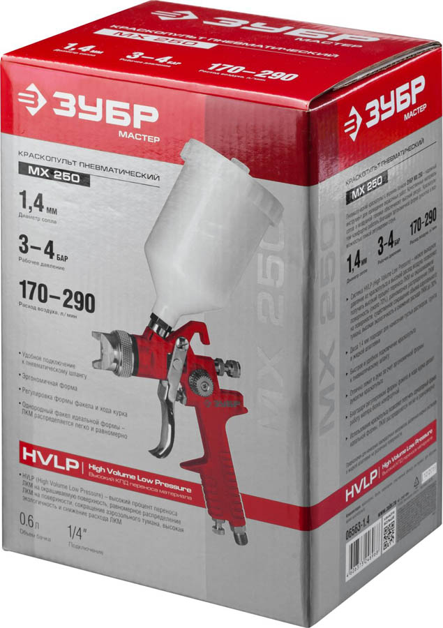 Краскопульт пневматический ЗУБР "МАСТЕР" "МХ 250", c верхним бачком, 1,4мм