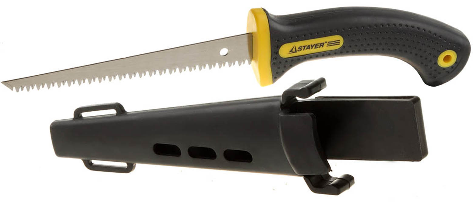 Ножовка по гипсокартону STAYER 2-15170, применяется для продольной и поперечной распиловки и выполнения фигурных прорезей древесины различных пород средних и мелких размеров, ДСП.