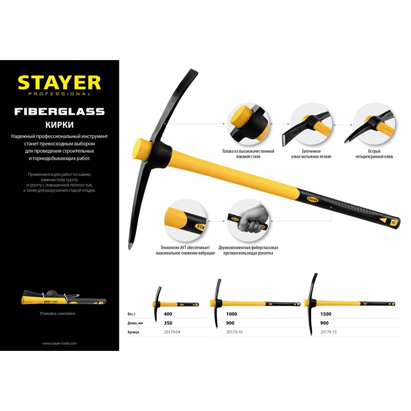 Кирка с фиберглассовой рукояткой STAYER 20179-04, предназначена для рубки льда, камня и прочих материалов. Технология AVT - минимум вибрации. Двухкомпонентная фиберглассовая противоскользящая рукоятка. Материал головы - кованая высококачественная сталь.