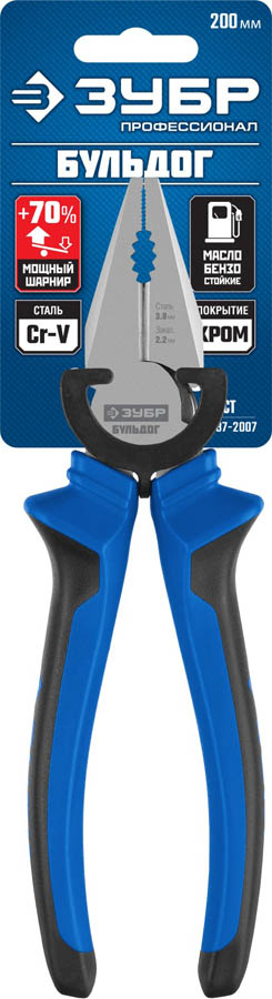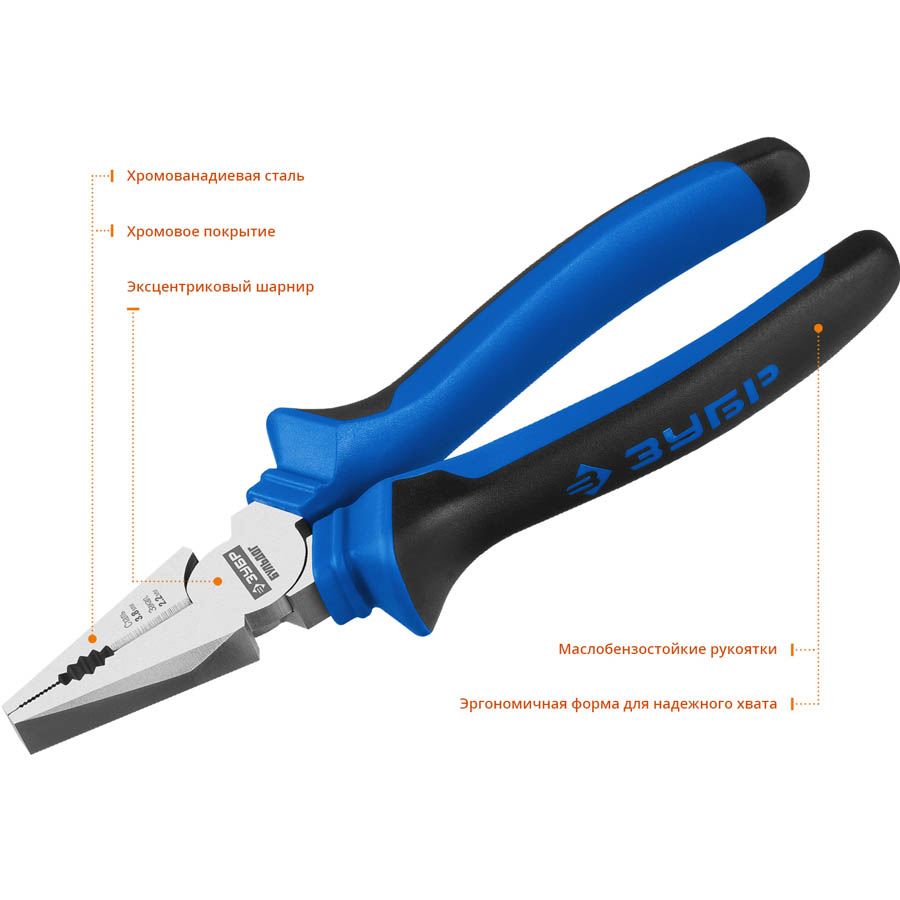 Плоскогубцы комбинированные "БУЛЬДОГ", эксцентр.располож.шарнира, особостойкое покрытие Н12Х1(Ni-Cr), двухкомп рукоятки, 200мм, ЗУБР Профессионал