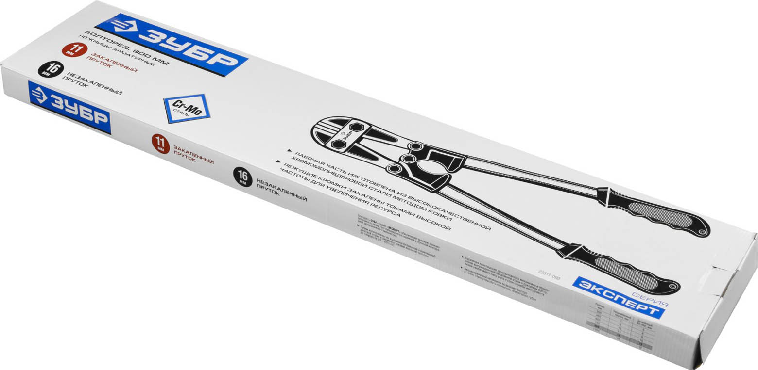 Болторез ЗУБР 23311-090, применяется для перекусывания металлических прутов, проволоки, в том числе закаленной, и строительной арматуры, снятия силовых запорно-пломбировочных устройств болтового и тросового типа. Чрезвычайно высокая производительность резки, обеспечивается надежной и прочной конструкцией двух рычажного механизма. Губки изготовлены из высококачественной хромомолибденовой стали и закалены токами высокой частоты до твердости 55-60 HRC. Надежная конструкция двухрычажного механизма и применение высокопрочной закаленной стали в рукоятках болторезов увеличивает силу реза и срок службы инструмента.