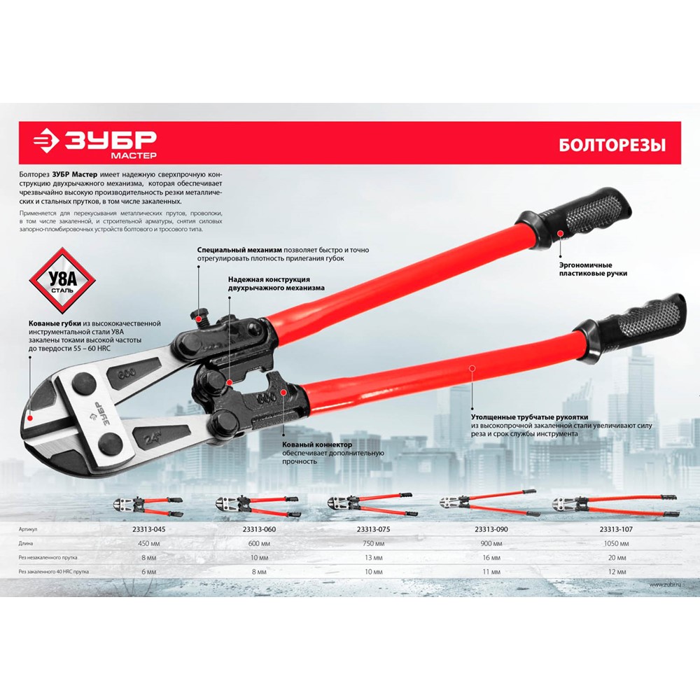 Болторез ЗУБР 23313-090, применяется для перекусывания металлических прутов, проволоки, в том числе закаленной, и строительной арматуры, снятия силовых запорно-пломбировочных устройств болтового и тросового типа. Губки изготовлены из высококачественной хромомолибденовой стали и закалены токами высокой частоты до твердости 55-60 HRC. Надежная конструкция двухрычажного механизма и применение высокопрочной закаленной стали в рукоятках болторезов увеличивает силу реза и срок службы инструмента.