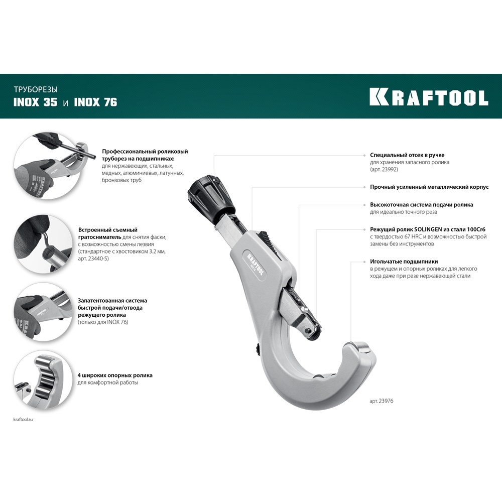 INOX профессиональный роликовый труборез на подшипниках: для нержавеющих, стальных, медных, алюминиевых, латунных, бронзовых труб с толщиной стенки до 2мм. Режущий ролик из 100Cr6 SOLINGEN GERMANY, 67 HRC. Игольчатые подшипники в режущем и опорных роликах для легкого хода. Система мгновенного подвода режущего элемента. Высокоточная система подачи ролика для идеально точного реза. Быстрая замена ролика без инструментов. Металлический корпус