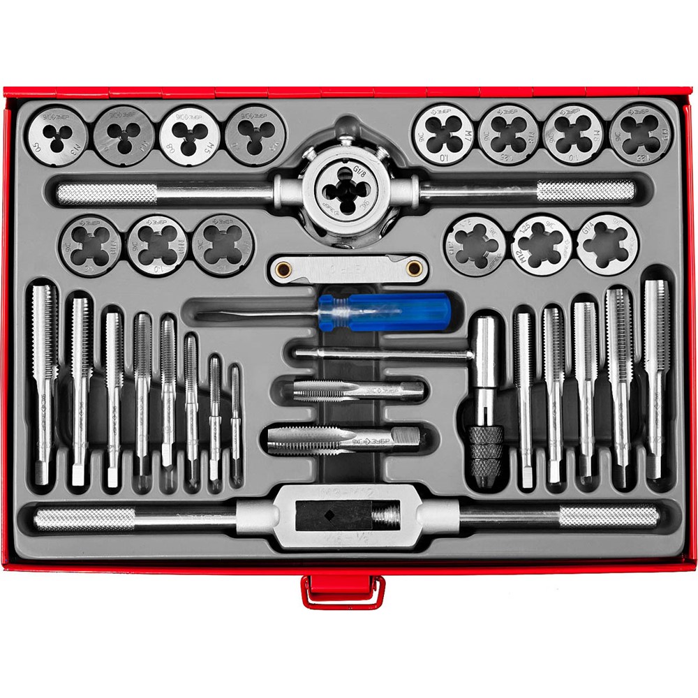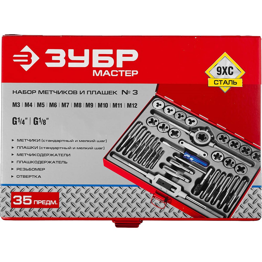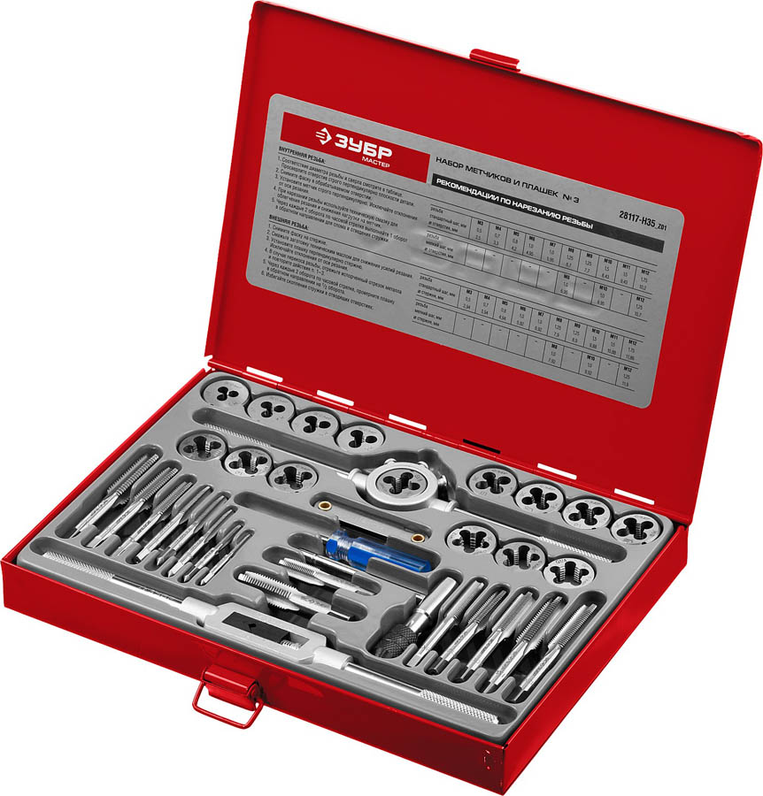 Набор метчиков и плашек ЗУБР "МАСТЕР", сталь 9ХС, 35 предметов