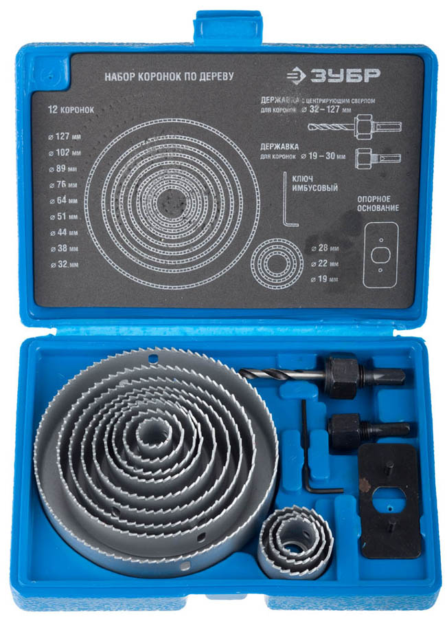 Набор: Коронки по дереву 19-127мм, державка 19-30мм, державка с опорн. основан, ключ имбус. 2,5мм, 15 пред, ЗУБР