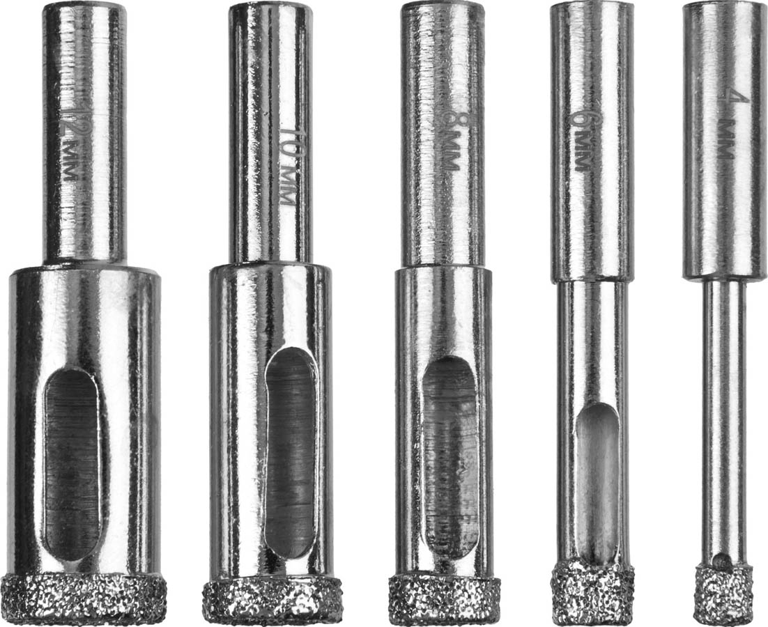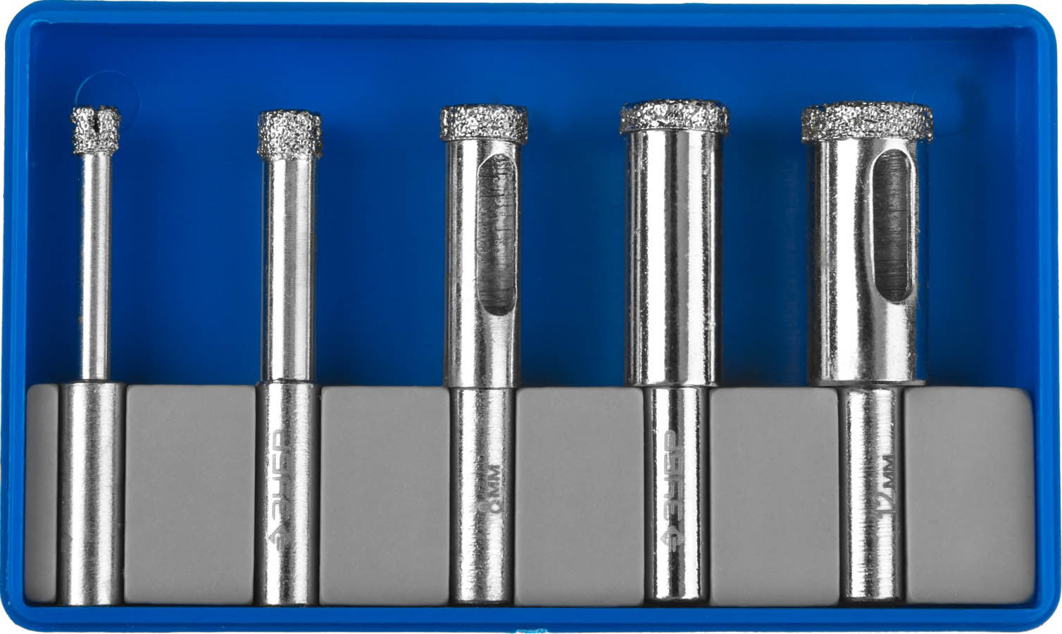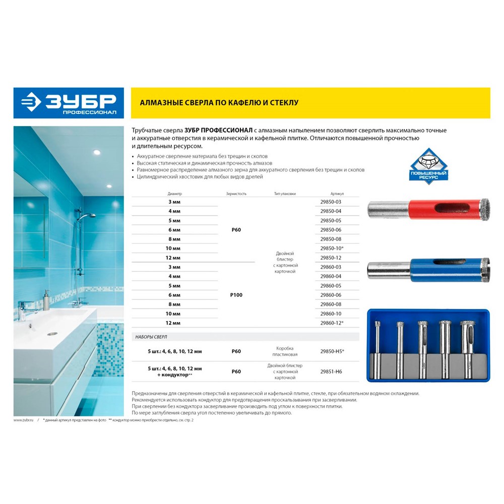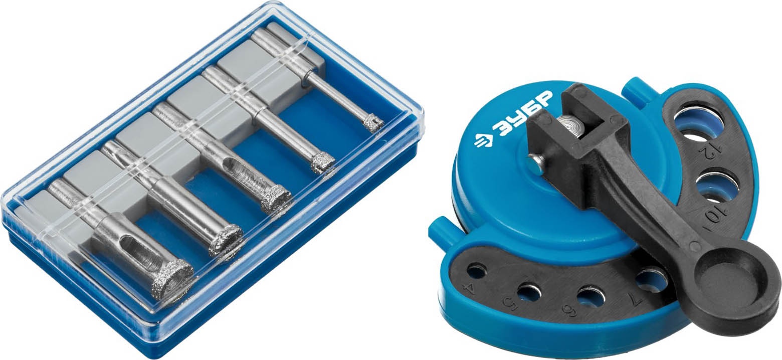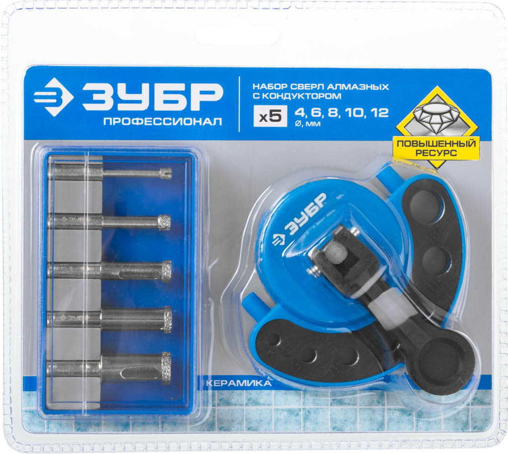 Набор сверл алмазных трубчатых по кафелю и стеклу с кондуктором, d=4, 6, 8, 10, 12 мм, 5 предметов, ЗУБР Профессионал 29851-H6