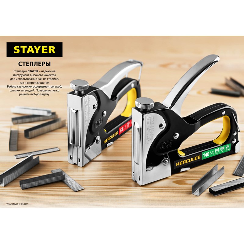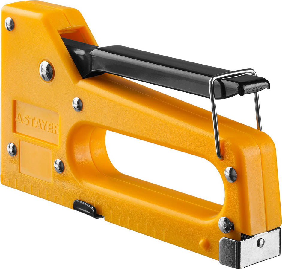 Степлер мебельный строительный STAYER 3140_z01, применяется для работы при креплении различных материалов с помощью скоб. Для узкой скобы. Прочный корпус из ABS пластика. Боек из закаленной стали.