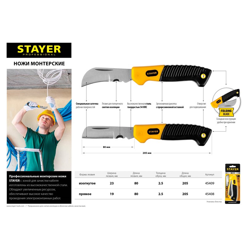 Нож монтерский STAYER 45408, предназначен для снятия изоляции и оболочки кабеля, зачистки жил. Специальная заточка рабочих поверхностей. Лезвие для поперечного снятия изоляции. Высококачественная сталь твердостью 54 HRC. Эргономичная рукоятка с прорезиненной вставкой. Отверстие для подвешивания. Складная конструкция удобна при хранении. Обладают увеличенным ресурсом, обеспечивают высокое качество проведения электромонтажных работ.