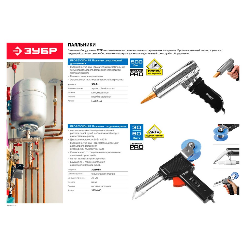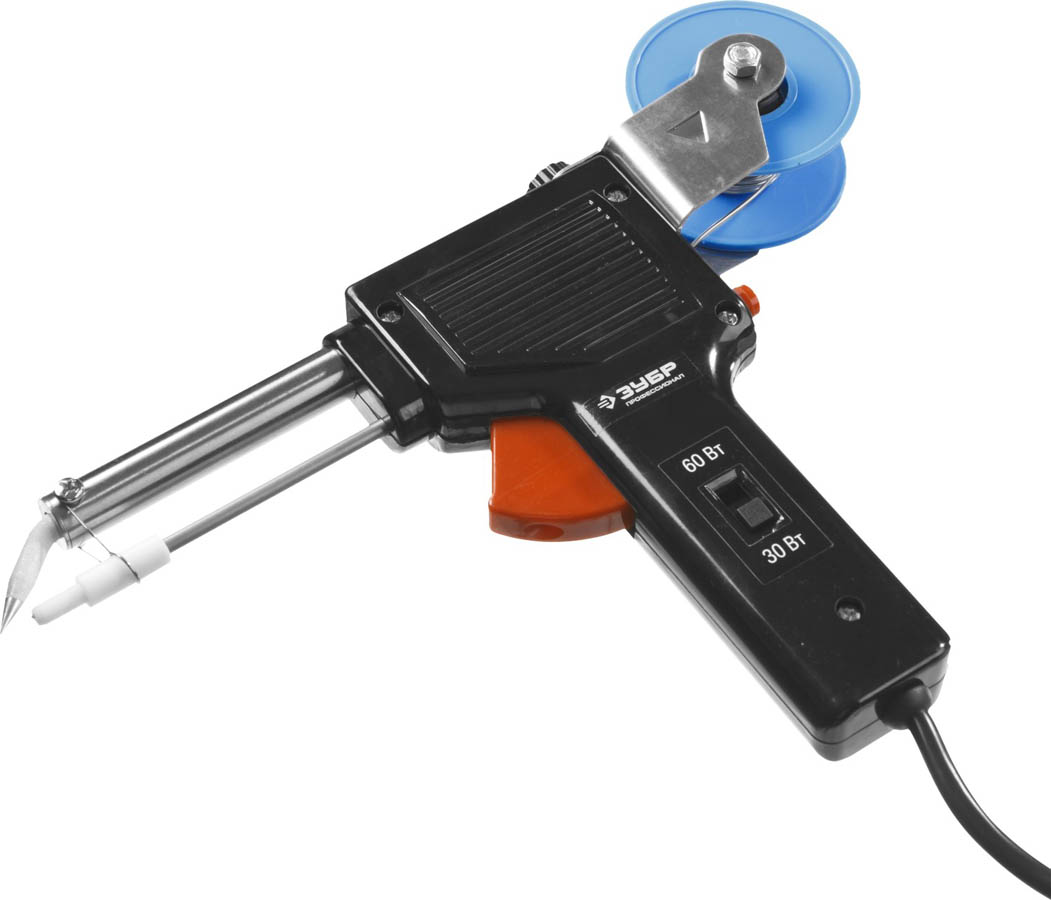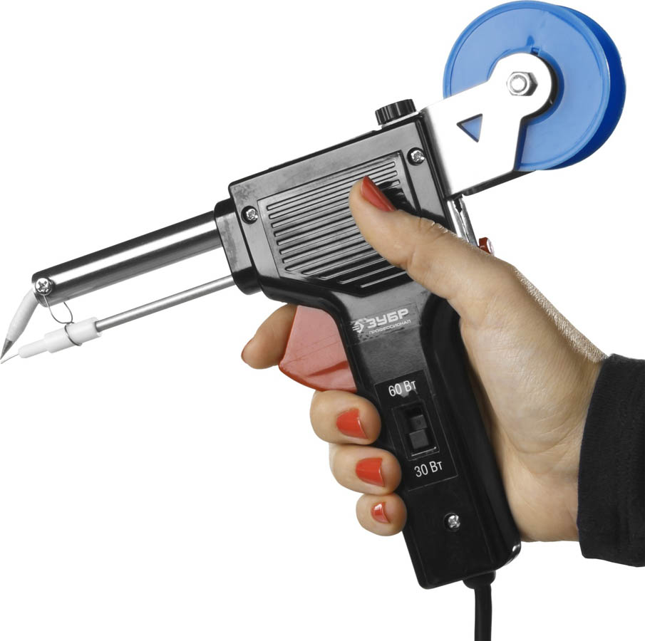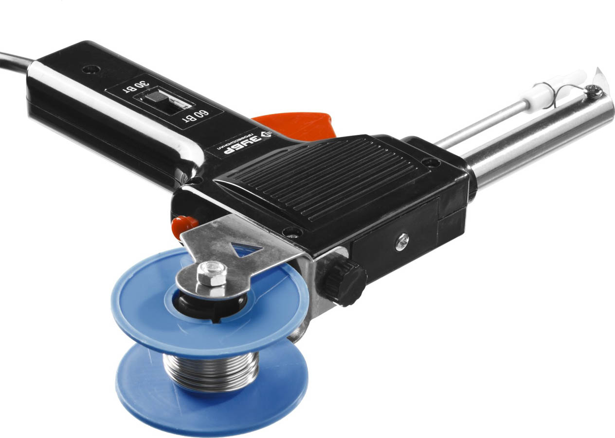 Паяльник ЗУБР "ПРОФЕССИОНАЛ" с подачей припоя, 2 мощности (30Вт/60Вт), диаметр проволоки припоя от 1 до 3мм