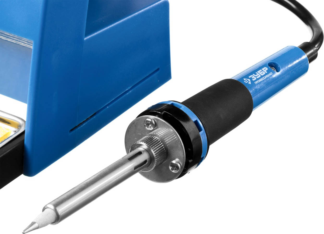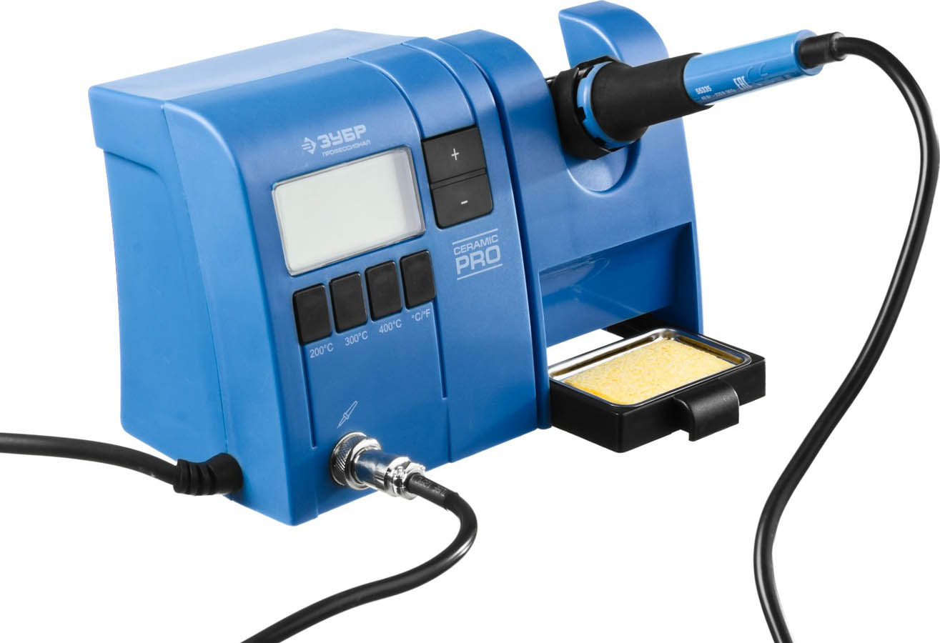 Паяльная станция ЗУБР 55335, применяется для паяльных работ, требующих бережную пайку при определенной температуре. станция ЗУБР особенно удобна при пайке электронных плат и других мелких деталей, поскольку поддерживает заданную температуру и не нуждается в отключении от электросети во время работы. Температура устанавливается с помощью кнопок, отвечающих за увеличение/уменьшение температуры с шагом 1С, а также с помощью кнопок фиксированных температур. На ЖК-дисплее отображается процесс нагревания/остывания и температура жала паяльника. Выключатель обеспечивает удобство эксплуатации паяльной станции. В станции предусмотрен отсек для очистки жала от припоя. Подставка, поставляемая в комплекте, удобна при выполнении паяльных работ и обеспечивает безопасность.