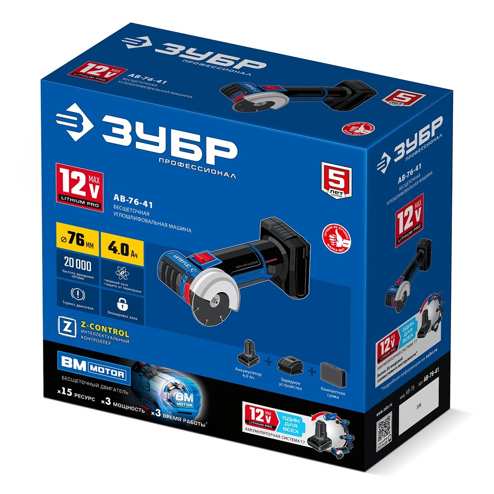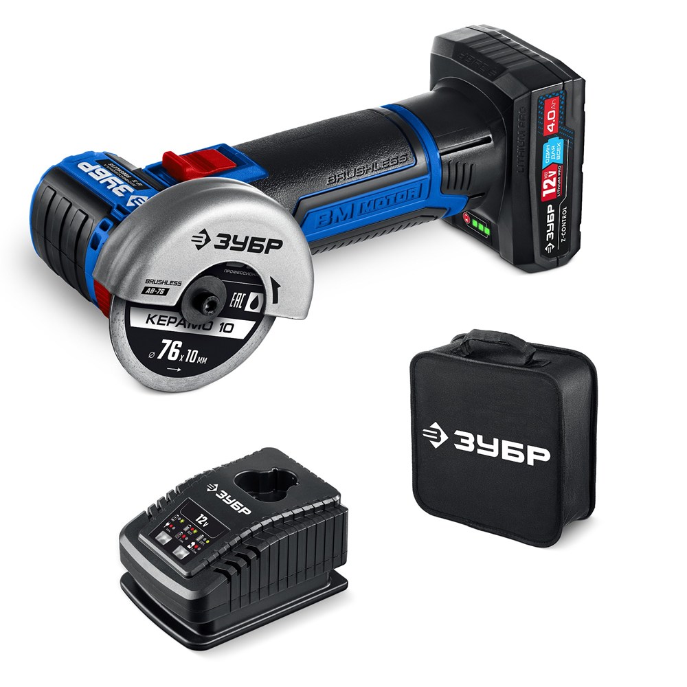 ЗУБР 12 В, D76 мм, 1 АКБ тип Т7 (4 А·ч), бесщеточная УШМ, сумка, Профессионал (AB-76-41)