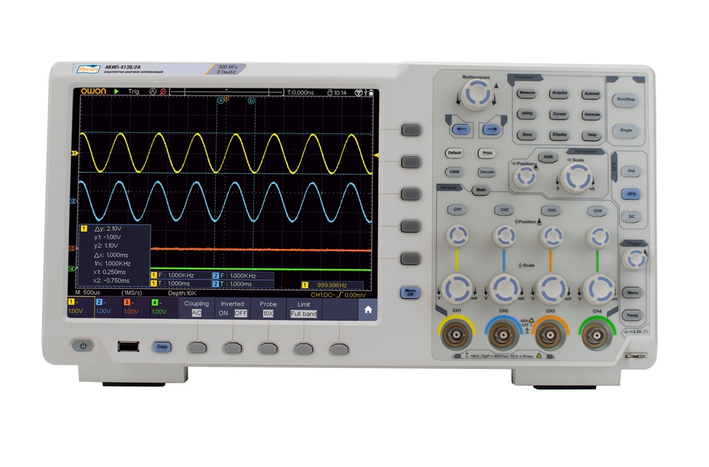 | Особенности | высокая скорость обновления экрана до 600.000 осц./сек. Интерполяция - sin x/х, линейная. Автоматические (до 40 параметров) и курсорные измерения. Математические функции, БПФ. Синхронизация и декодирование сигналов, UART/RS232, I2C, SPI, CAN. Встроенный генератор сигналов 50 МГц, мультиметр 4,5 разряда, частотомер 6 разрядов. |