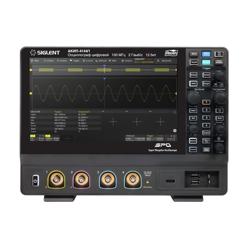 В серии АКИП-4144 используется технология Siglent SPO с максимальной скоростью захвата сигналов до 120 000 осциллограмм/с (нормальный режим, до 500 000 осциллограмм/с в последовательном режиме), 256-уровней градации интенсивности плюс режим отображения цветовой температуры. В серии используется инновационная цифровая система запуска с высокой чувствительностью и низким джиттером. Система запуска поддерживает несколько мощных режимов, включая запуск по последовательной шине. Инструменты, такие как запись истории сигнала, функции поиска и навигации, тест по маске, график Боде, анализ мощности позволяют захватывать, сохранять и анализировать расширенные записи осциллограмм. Впечатляющий набор измерительных и математических возможностей, опции для генератора сигналов произвольной формы с частотой 25 МГц, а также декодирование последовательных сигналов также являются особенностями АКИП-4144.