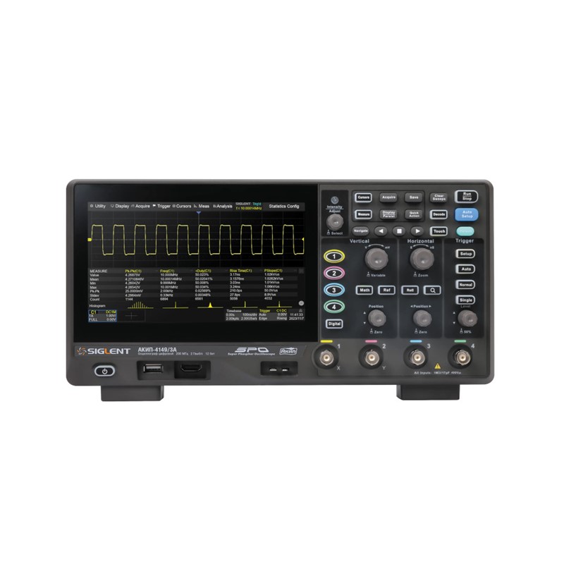В серии АКИП-4149 используется технология Siglent SPO с максимальной скоростью захвата сигналов до 120 000 осциллограмм/с (нормальный режим, до 500 000 осциллограмм/с в последовательном режиме), 256-уровней градации интенсивности плюс режим отображения цветовой температуры. В серии используется инновационная цифровая система запуска с высокой чувствительностью и низким джиттером. Система запуска поддерживает несколько мощных режимов, включая запуск по последовательной шине. Инструменты, такие как запись истории сигнала, функции поиска и навигации, тест по маске, график Боде, анализ мощности позволяют захватывать, сохранять и анализировать расширенные записи осциллограмм. Впечатляющий набор измерительных и математических возможностей, опции для генератора сигналов произвольной формы с частотой 25 МГц, а также декодирование последовательных сигналов также являются особенностями АКИП-4149.