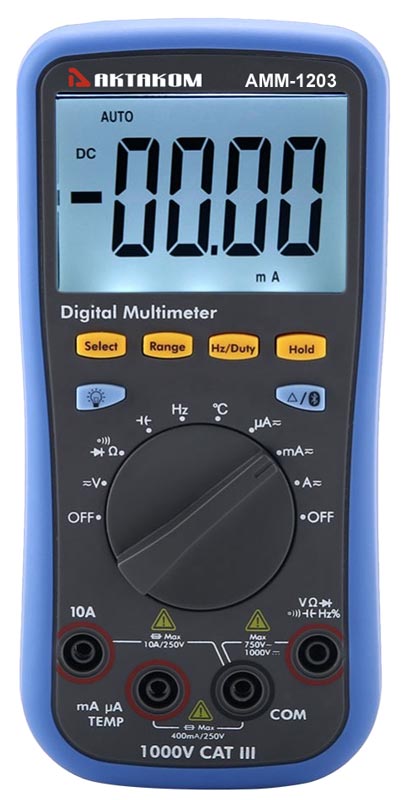 Цифровой мультиметр с функцией регистратора и Bluetooth интерфейсом. Большой ЖКИ 3 3/4 разряда (3999 отсчетов) с подсветкой. Постоянное напряжение 1000 В ±(0,5%); переменное напряжение 750 В ±(0,8%); постоянный ток 10 А ±(0,8%); переменный ток 10 А ±(0,8%); сопротивление 40 МОм ±(0,8%); ёмкость 100 мкФ ±(2,5%); частота 5 МГц ±(0,8%); коэффициент заполнения, температура -50 °С…400 °С; тест диодов; прозвонка. Бесконтактный датчик напряжения. Функция регистратора (до 7 дней). Относительные измерения. Удержание показаний. Озвучивание результата. Авто и ручной выбор диапазона. Автоотключение. Защита от перегрузок 1000 В, CATIII. Bluetooth модуль BLE 4.0. Питание 3 В. Размеры 185x85x30 мм. Масса 320 г.