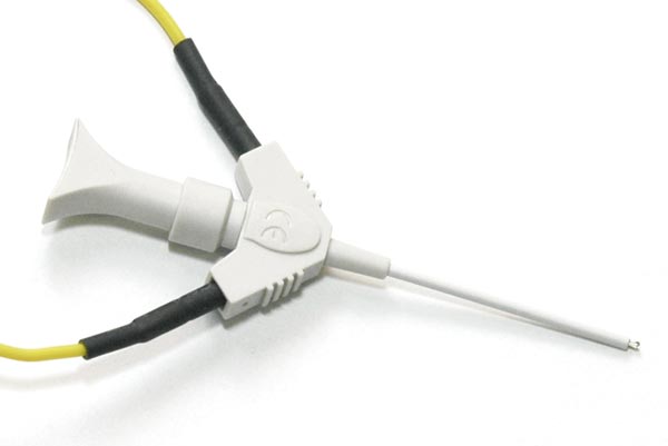 Миниклипса c выдвигающимся фиксатором. При нажатии на кнопку из наконечника клипсы выдвигается зажим. Длина наконечника 25 мм, максимальный угол раскрытия захвата до 40 градусов, максимальное выдвижение зажима до 4 мм. Прилагается минипровод - 1 шт. Длина провода 20 см или 25 см (по запросу).