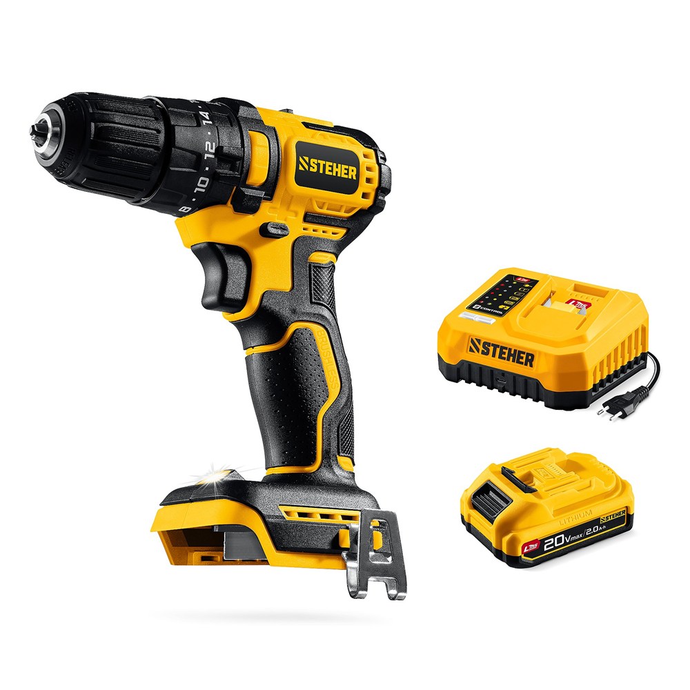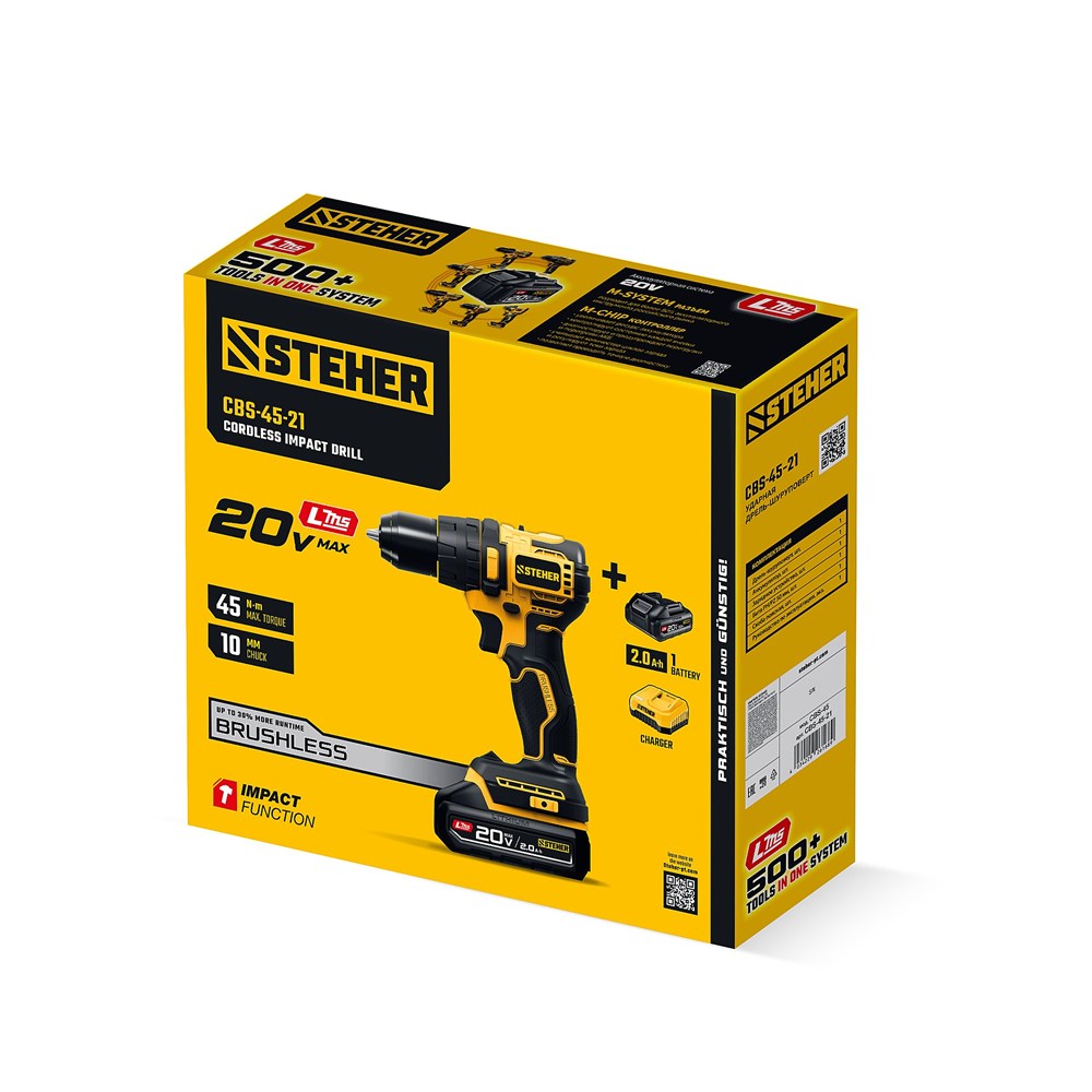 STEHER 20 В, 45 Н·м, 1 АКБ LMS (2 А·ч), бесщеточная ударная дрель-шуруповерт (CBS-45-21)