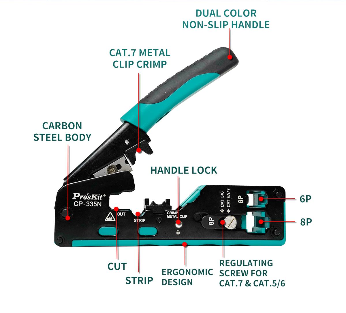 Pro’sKit CP-335N – это компактный модульный кримпер 3-в-1 для точной резки, зачистки и обжима сетевых коннекторов CAT 5/6/7. Инструмент имеет надежную прочную конструкцию механизма с параллельным ходом обжимных губок, что позволяет сэкономить время и усилия, необходимые для обжима коннекторов. Конструкция оснащена регулировочным винтом для легкой и быстрой замены коннекторов CAT 5/6 и CAT 7.