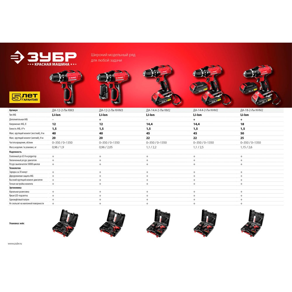 Аккумуляторная дрель шуруповерт ЗУБР ДА-14.4-2-Ли КМ2, предназначена для сверления отверстий в различных материалах (при установке сверла), а также для вкручивания/выкручивания шурупов, саморезов и винтов (при установке соответствующих бит). Высокий крутящий момент при широком диапазоне оборотов благодаря конструкции редуктора. Литий-ионная технология ЗУБР нового поколения: увеличение производительности на 35%; электронная система защиты от перегрузки, перегрева и глубокой разрядки; отсутствие эффекта памяти; отсутствие потери мощности в процессе работы. Бесключевой быстрозажимной патрон для максимального ускорения замены расходного инструмента. Двухскоростной планетарный редуктор позволяет как заворачивать с большим крутящим моментом, так и сверлить на высоких оборотах. Тормоз двигателя для ускорения серийной работы. Широкий диапазон регулировки крутящего момента превращает изделие в универсальный инструмент: от аккуратного закручивания винтиков до мощного заворачивания саморезов.