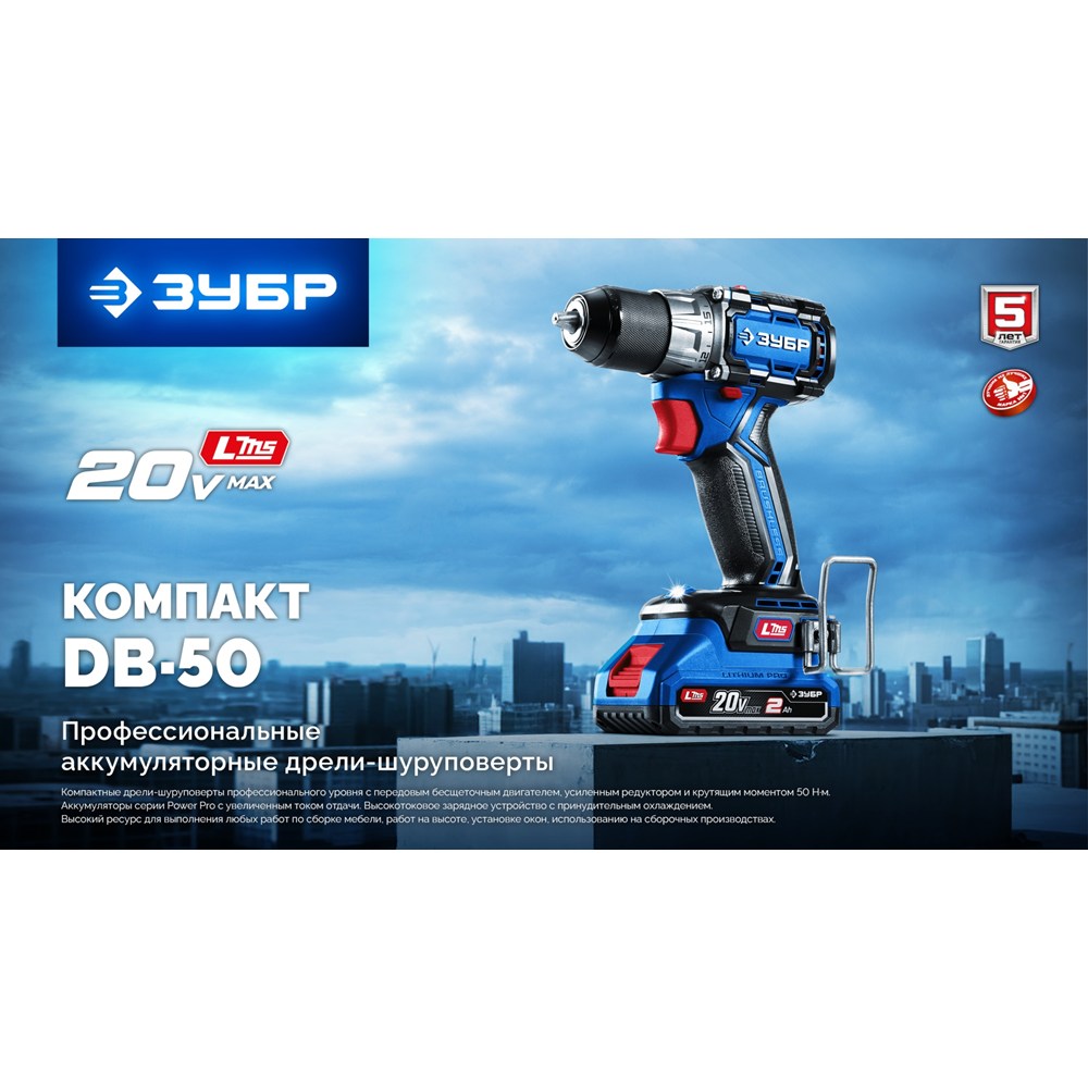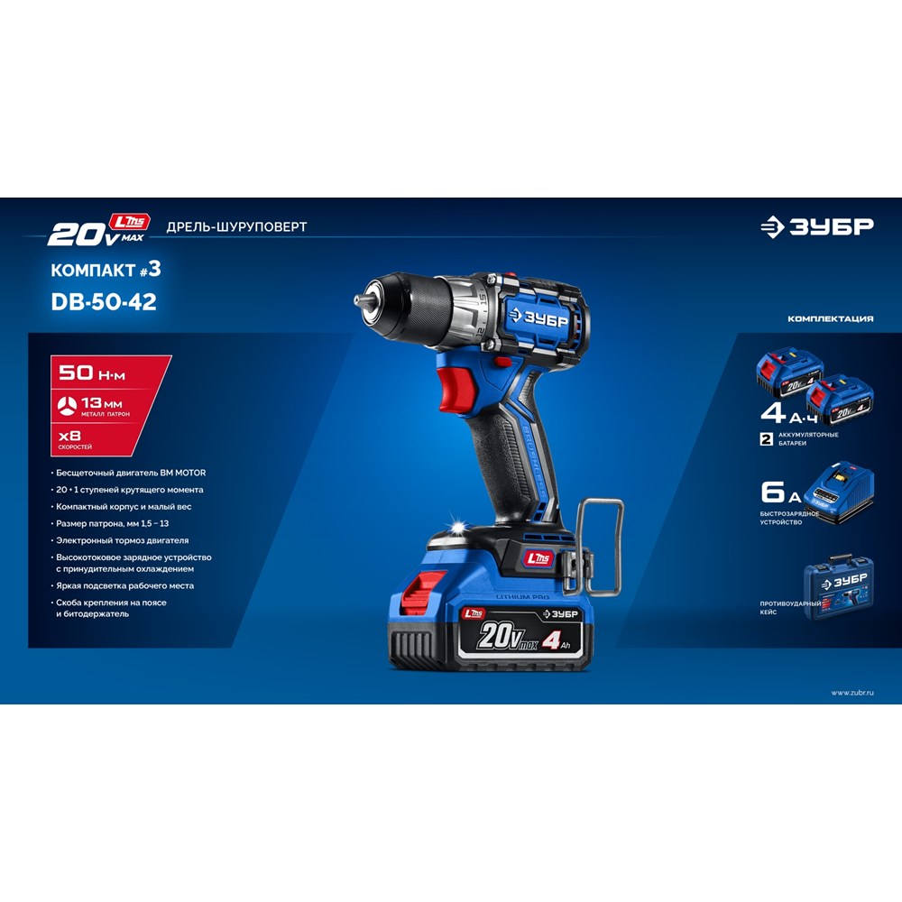 Бесщеточная дрель-шуруповерт КОМПАКТ #3 20 В, 50 Н·м, 2 АКБ LMS (4 А·ч), кейс, ПРОФЕССИОНАЛ (DB-50-42)