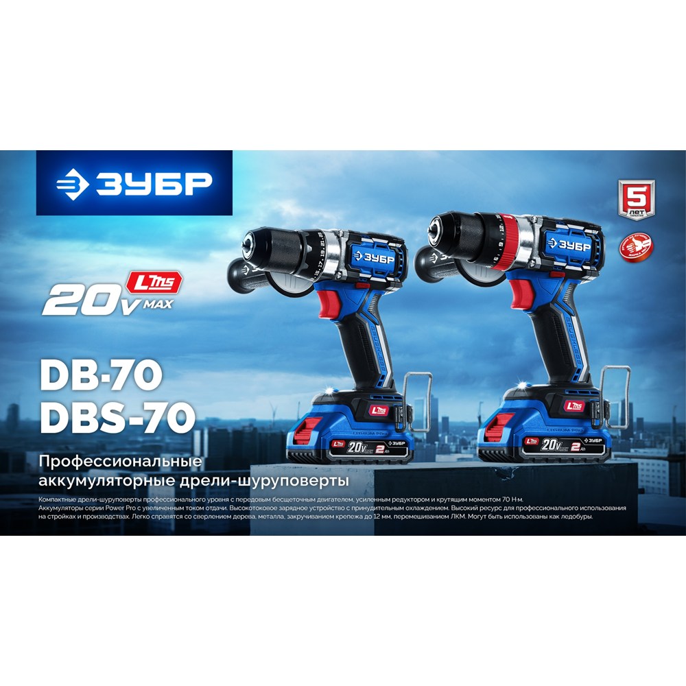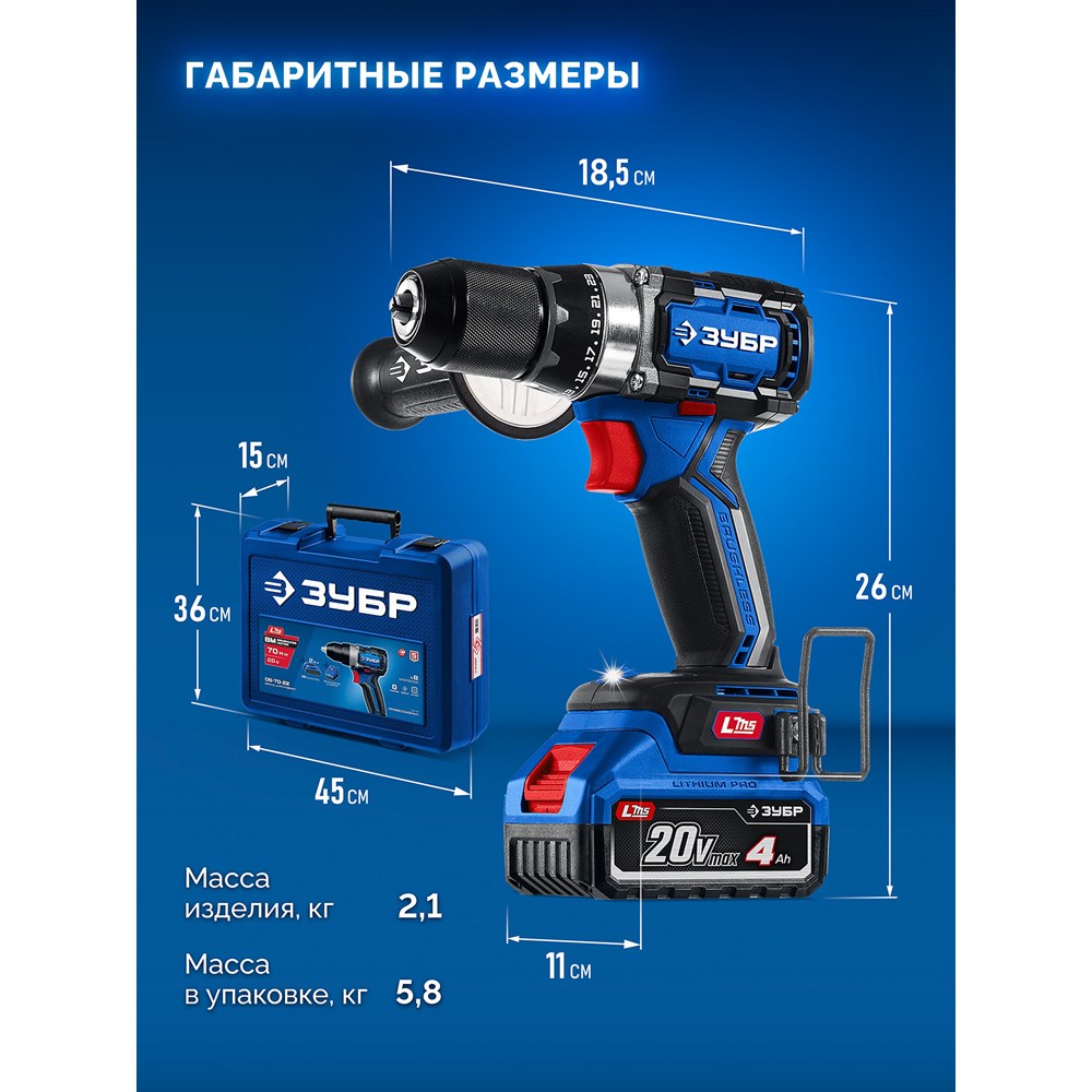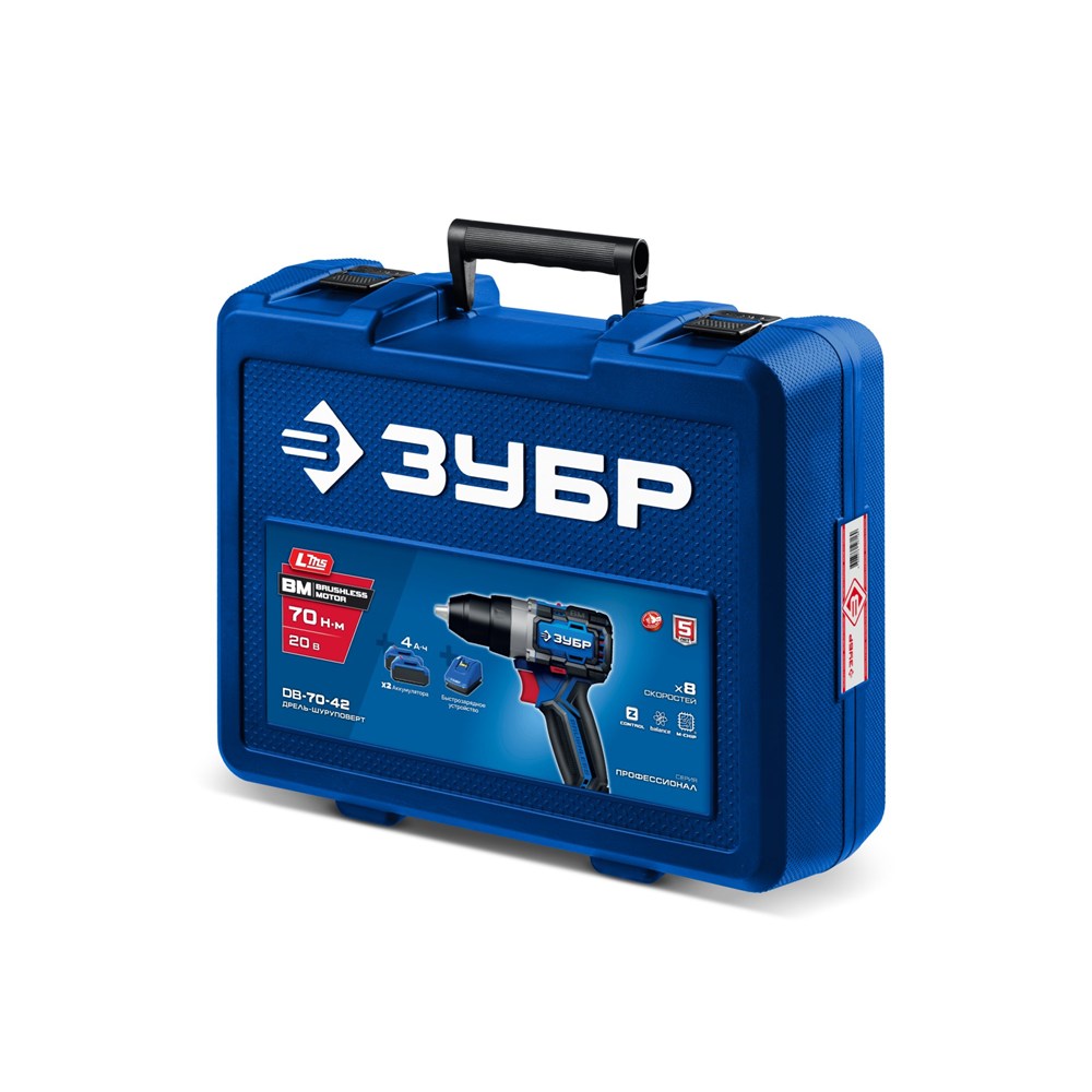 Бесщеточная дрель-шуруповерт, 20 В, 70 Н·м, 2 АКБ LMS (4 А·ч), кейс, ПРОФЕССИОНАЛ (DB-70-42)