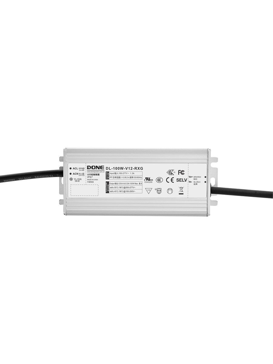 Водонепроницаемый блок питания серии RXG-W со степенью защиты IP67, регулируемой яркостью и постоянным напряжением, работает в диапазоне входного напряжения 90–305 В переменного тока.