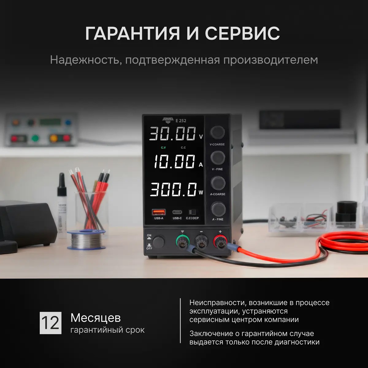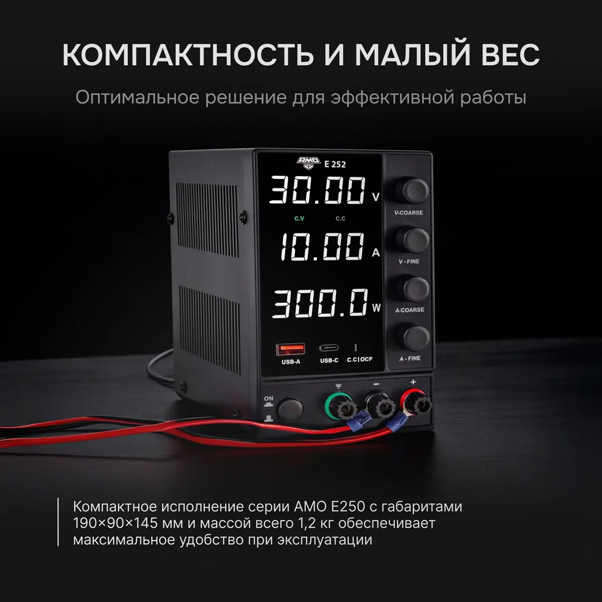 • Напряжение: 0,01–30 В, ток: 0,001–10 А, мощность до 300 Вт
