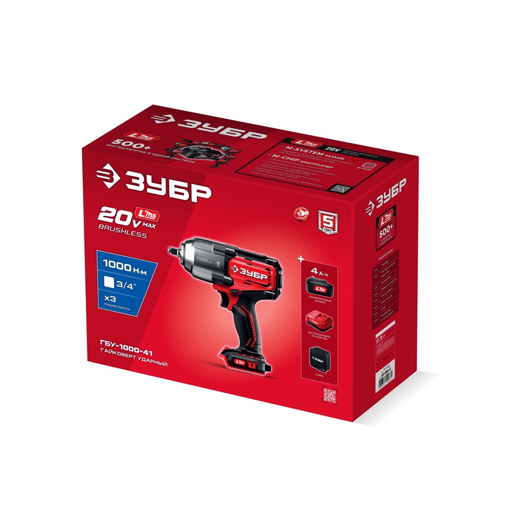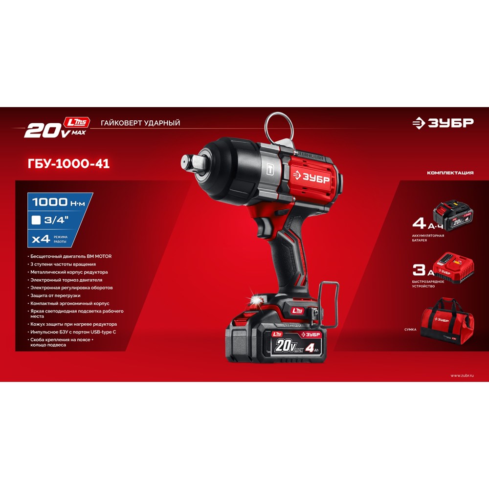 Бесщеточный ударный гайковерт, 20 В, 1000 Н·м, 1 АКБ LMS (4 А·ч), сумка (ГБУ-1000-41)