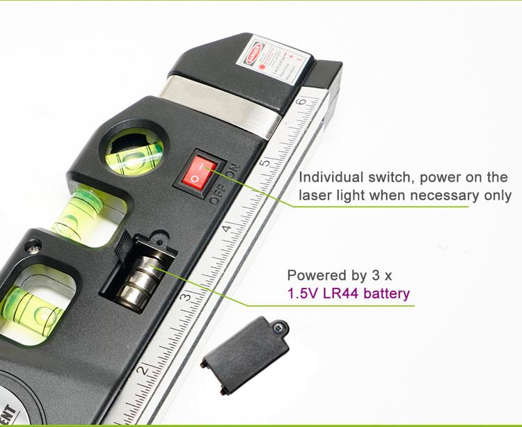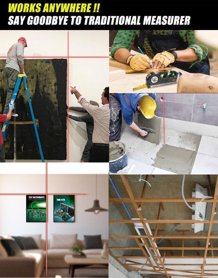 Устройство 4 в 1: рулетка, стандартная линейка, тройной ватерпас и лазерный уровень.