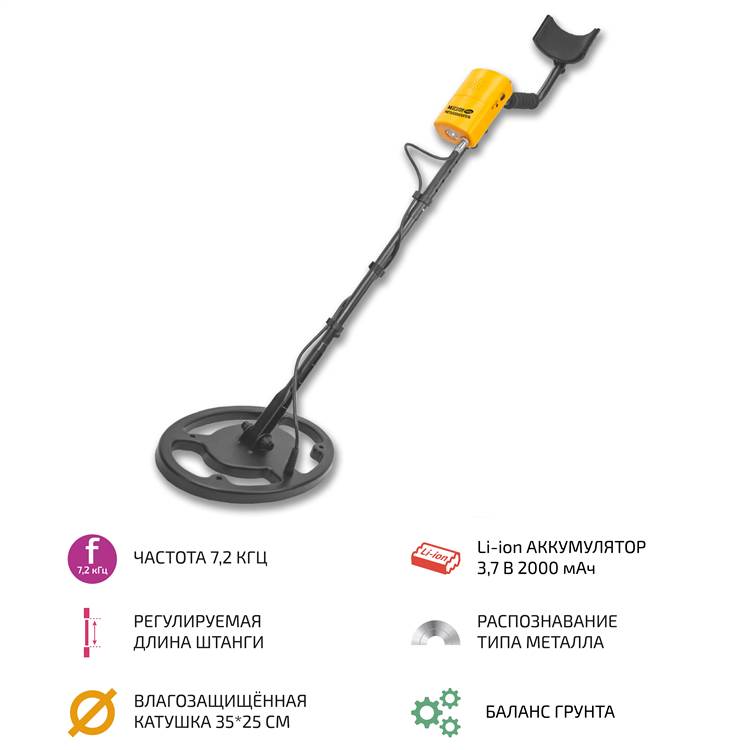 рунтовый металлоискатель МЕГЕОН 45010 с рабочей частотой 7,2 кГц предназначен для поиска и распознавания мелких металлических объектов на небольшой глубине. Прибор имеет настраиваемую функцию дискриминации, позволяющую отделить цветные металлы от чёрных и отсеять лишнее. Также предусмотрена настройка баланса грунта для компенсации помех, связанных с минерализацией почвы. Металлодетектор укомплектован регулируемой по длине штангой с быстросъёмным механизмом и влагозащищённой поисковой катушкой 35х25 см. овальной формы, состоящей из двух концентрично расположенных обмоток, работающих на передачу и приём. Переданный и отражённый сигналы обрабатываются программным обеспечением микроконтроллера и преобразуются в звуковое и визуальное оповещение для пользователя. Питание осуществляется от литиевого аккумулятора ёмкостью 2000 мАч.