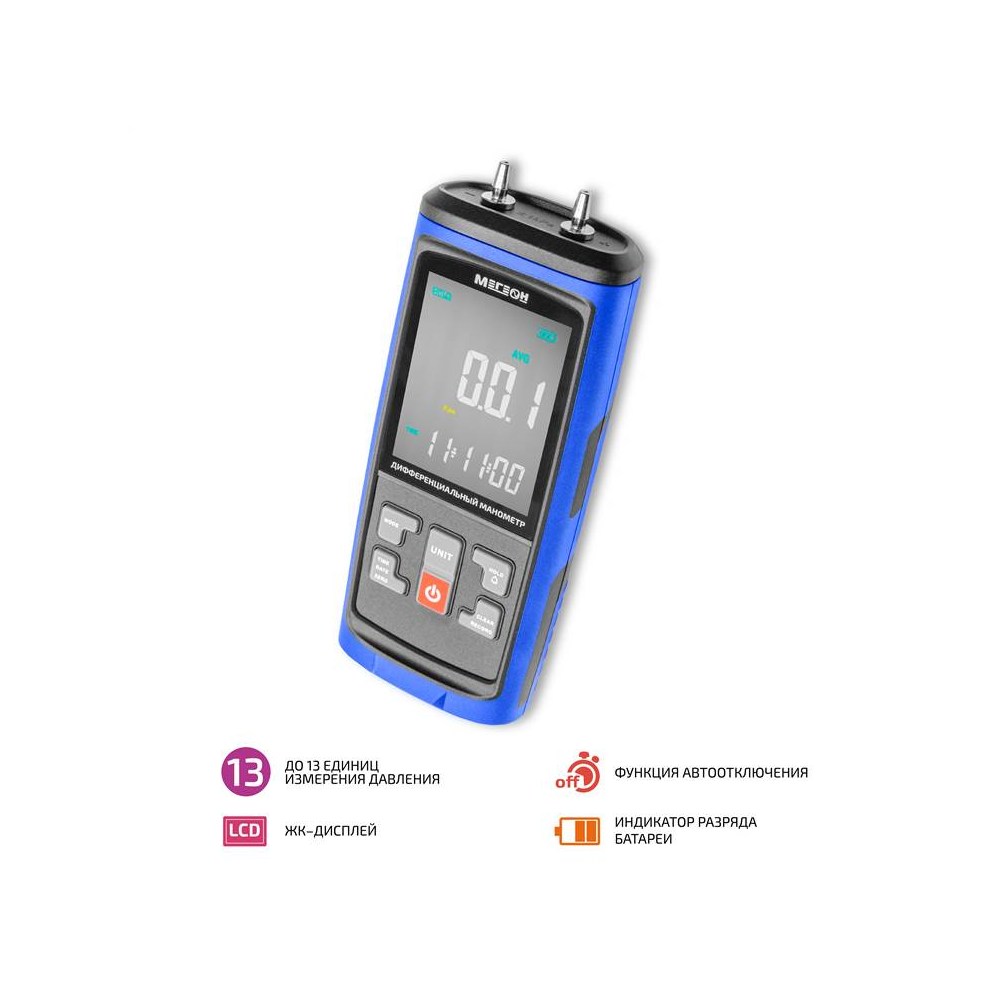 Прибор серии МЕГЕОН 5100Х - это цифровой дифференциальный манометр, предназначенный для измерения избыточного, пониженного и дифференциального давлений. Фиксация максимального, минимального и среднего значений и функция удержания данных значительно облегчат выполнение измерений. Возможность подключения к компьютеру позволяет выгрузить данные на ПК и проводить измерения с регистрацией в режиме реального времени. Прибор позволяет измерять давление в разных единицах. Изделия МЕГЕОН выгодно отличаются от существующих аналогов широкими функциональными возможностями и могут применяться для измерения расхода газов, контроль загрязненности фильтров и измерения избыточного давления в чистых помещения. Приведенный перечень далеко неполный. Функциональность по достоинству оценят как начинающие пользователи, так и профессионалы.