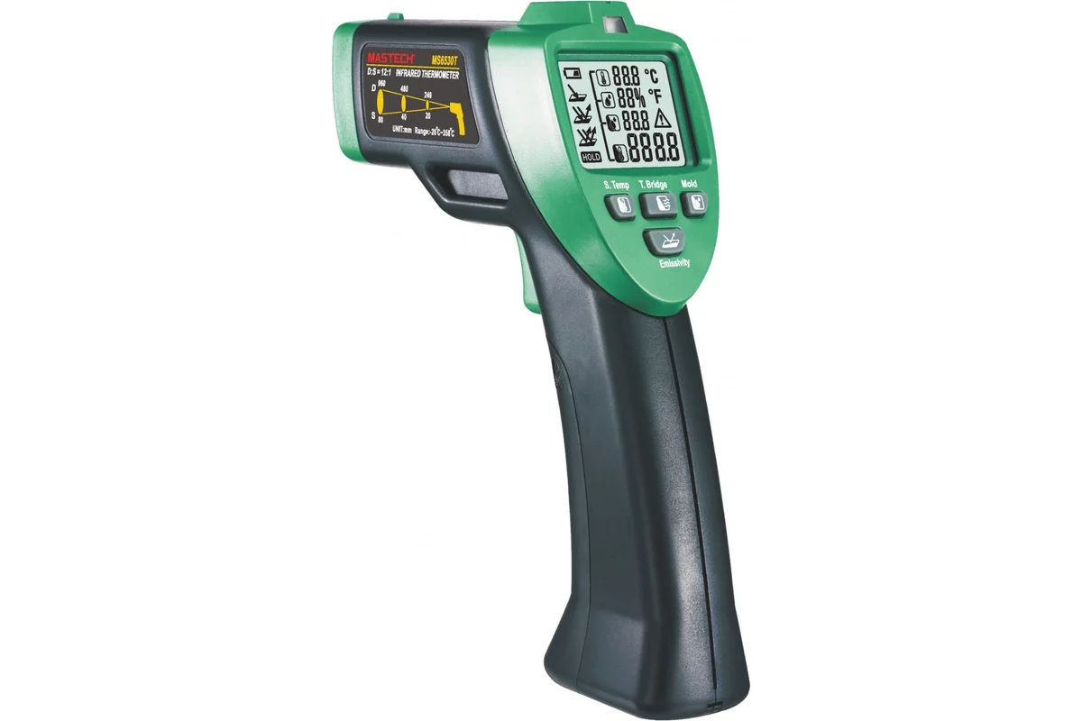 Дистанционный цифровой инфракрасный термометр Mastech MS6530T измеряет температуру твердых и жидких тел на расстоянии и в ограниченном пространстве.