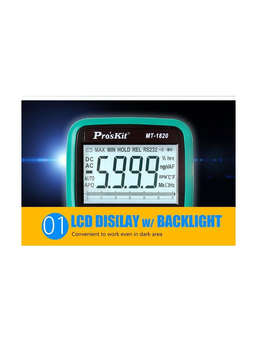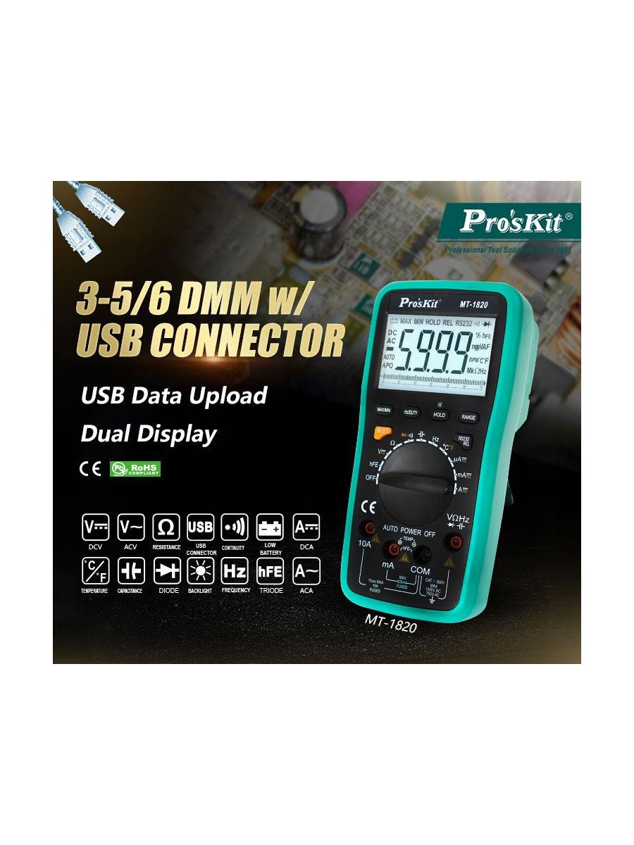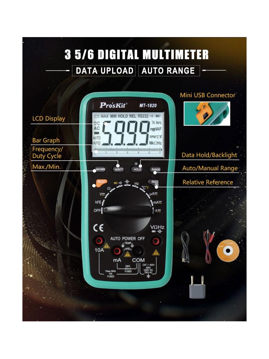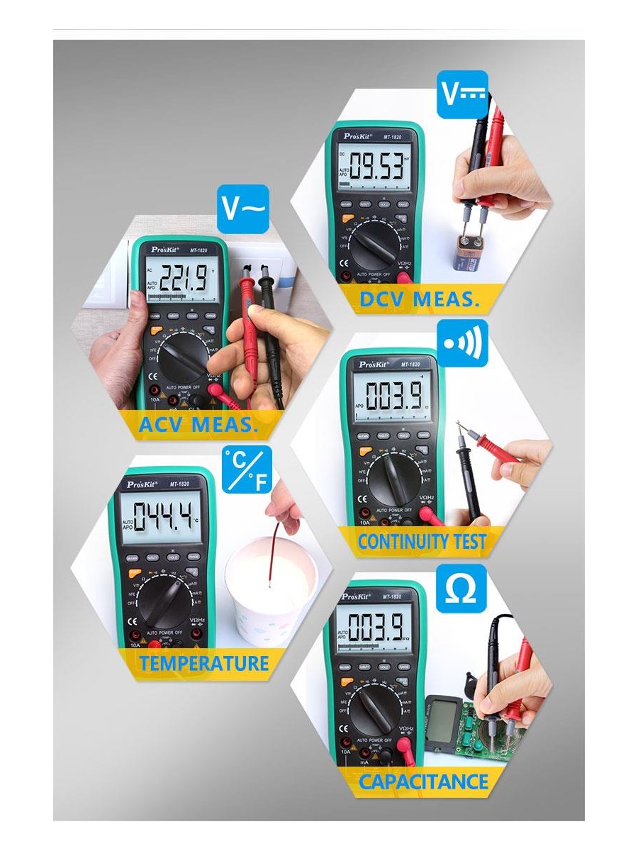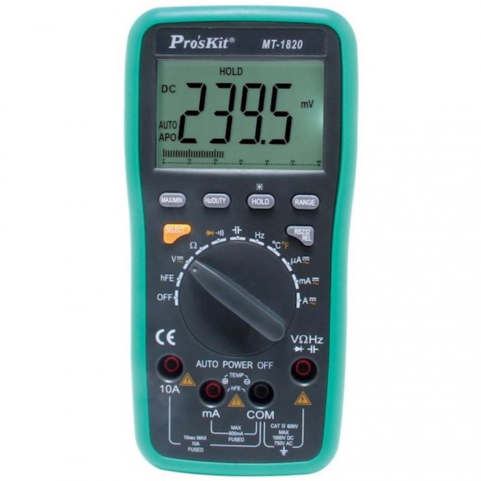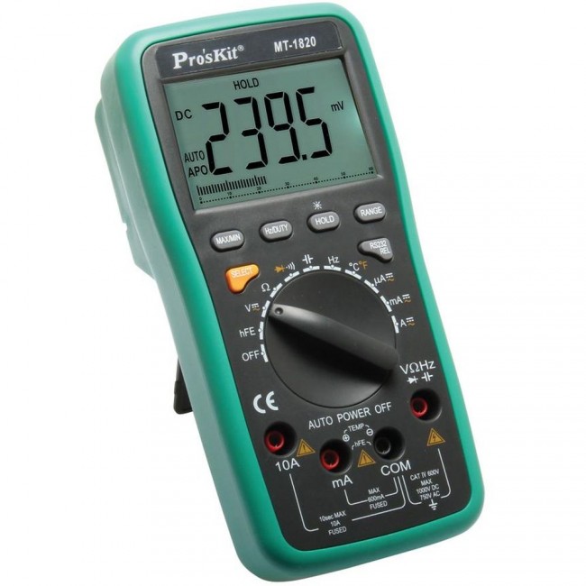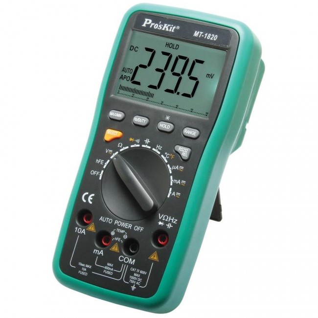 Мультиметр ProsKit MT-1820 - простой в эксплуатации прибор, предназначенный для измерения напряжения, силы тока, сопротивления, частоты, емкости и температуры. Выбор диапазона производится как вручную, так и автоматически.