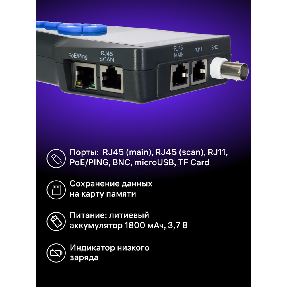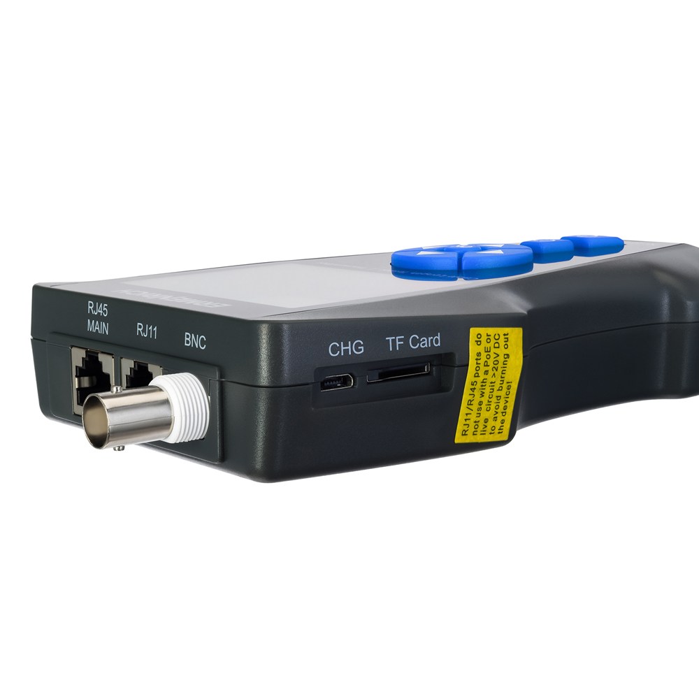 Компактный прибор для измерения длины кабелей до 1 км, а также для диагностики кабельных линий: поиска обрывов, коротких замыканий, перекрещенных, расщепленных и перевернутых пар. Позволяет не только обнаружить место обрыва или короткого замыкания, но и определить на каком расстоянии оно находится. Есть функции поиска и трассировки нужного кабеля в пучке (проблесковая индикация), определения порта, к которому подключен кабель, а также тестирования соединения Ethernet (тест PoE) и скорости передачи данных (PING-тест). Полученные данные отображаются на цветном LCD-дисплее с разрешением 320x240 пикс.
