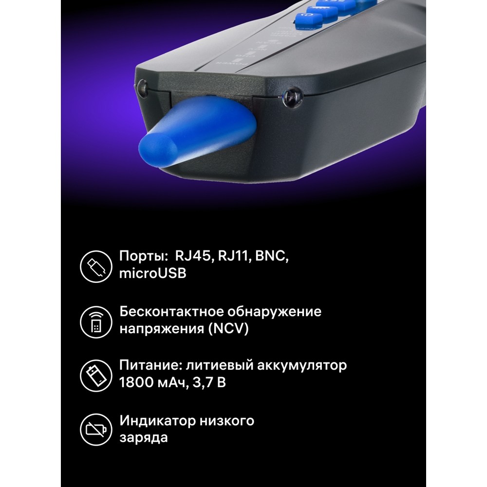 Измеритель работает с сетевыми кабелями категорий 5E/6/6A/7, электрическими, телефонными и прочими, имеющими металлический проводник. Измерения осуществляются по методу импульсной рефлектометрии. Для максимальной точности прибор можно откалибровать. Предусмотрена защита от электромагнитных помех. Устройство питается от литиевой аккумуляторной батареи емкостью 1800 мАч. Передатчик работает без подзарядки до 20 ч, приемник – до 50 ч. Есть функция энергосбережения: при бездействии измеритель автоматически отключается.