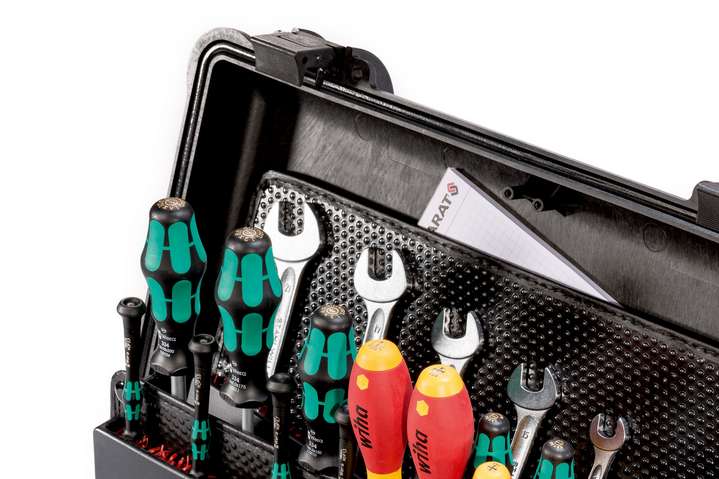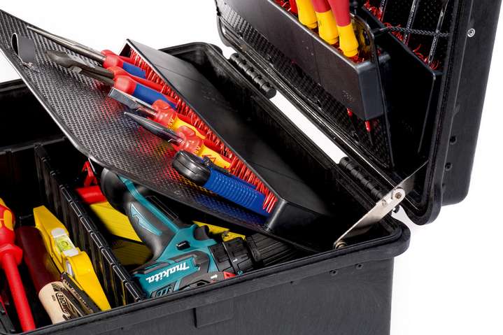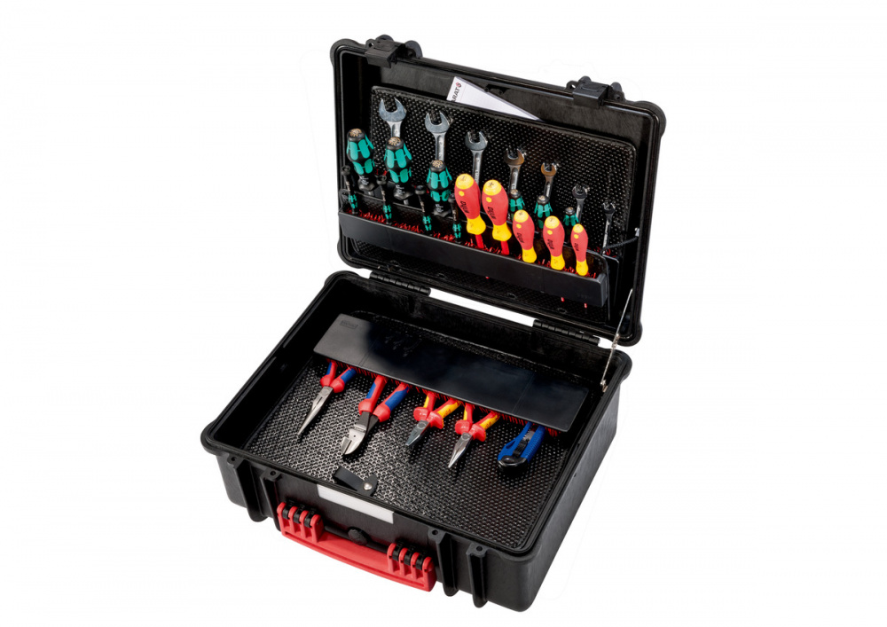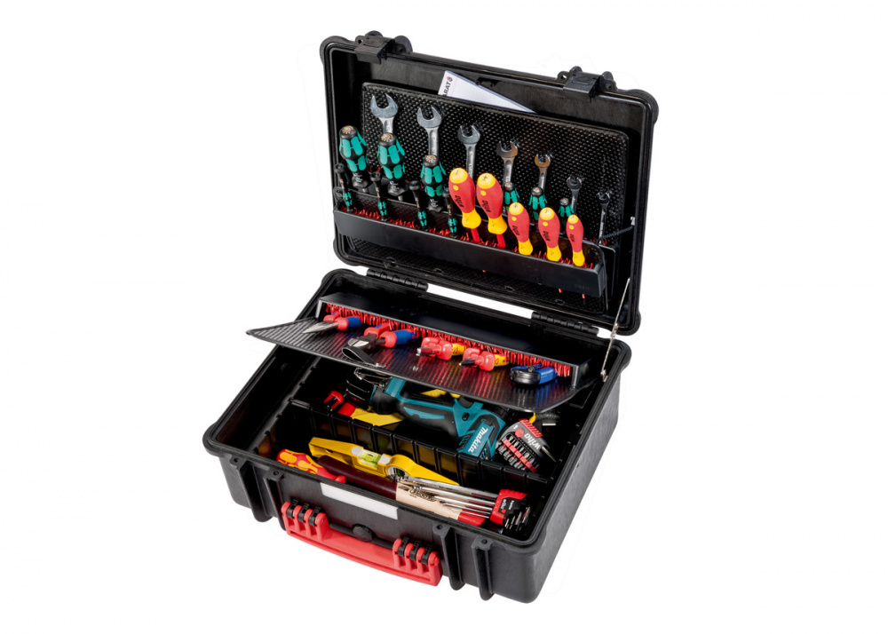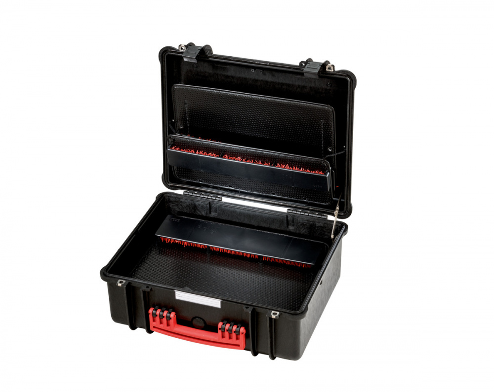 Инструментальные чемоданы серии PARAT PARAPRO впечатляют продуманным оснащением внутреннего пространства и особо прочным корпусом выполненным из полипропилена с обеспечением водо- и воздухонепроницаемости по классу IP67. Корпус не боится никаких повреждений и соответствует армейским стандартам. Инструментальный чемодан оснащён клапаном для автоматического выравнивания давления. На клрпусе имеется прозрачный шильдик для размещения важной информации. Защёлки работают легко и надёжно. Чемодан можно дополнительно закрыть на навесной замок (не входит в комплект поставки!). Инструментальный чемодан предлагается с двумя панелями для инструментов и одной накладной панелью на нижний отсек с держателем инструментов CP-7. Держатель инструментов CP-7 в PARAPRO Plus CP-7 рассчитан всего на 60 инструментов. Мелкие детали и дополнительные принадлежности можно спрятать в особо глубоком нижнем отсеке. Специальное отделение сохраняет важные документы. Удобное внутреннее пространство инструментального чемодана составляет 36 литров.