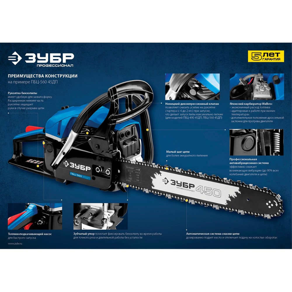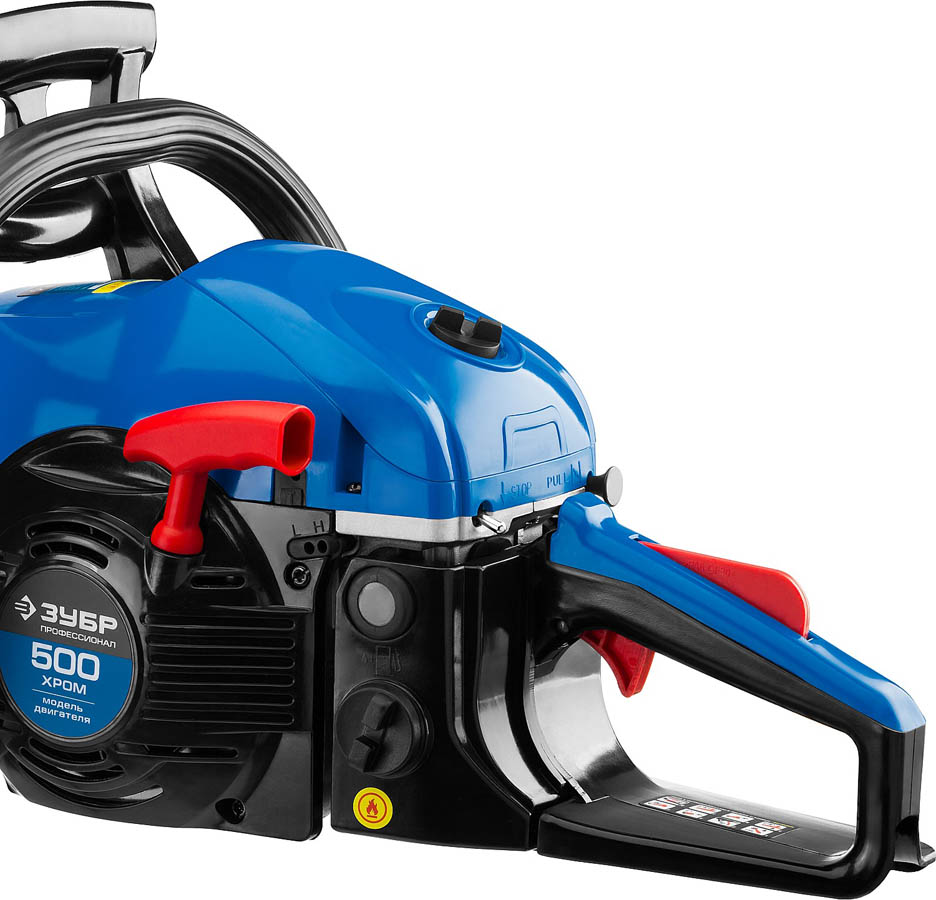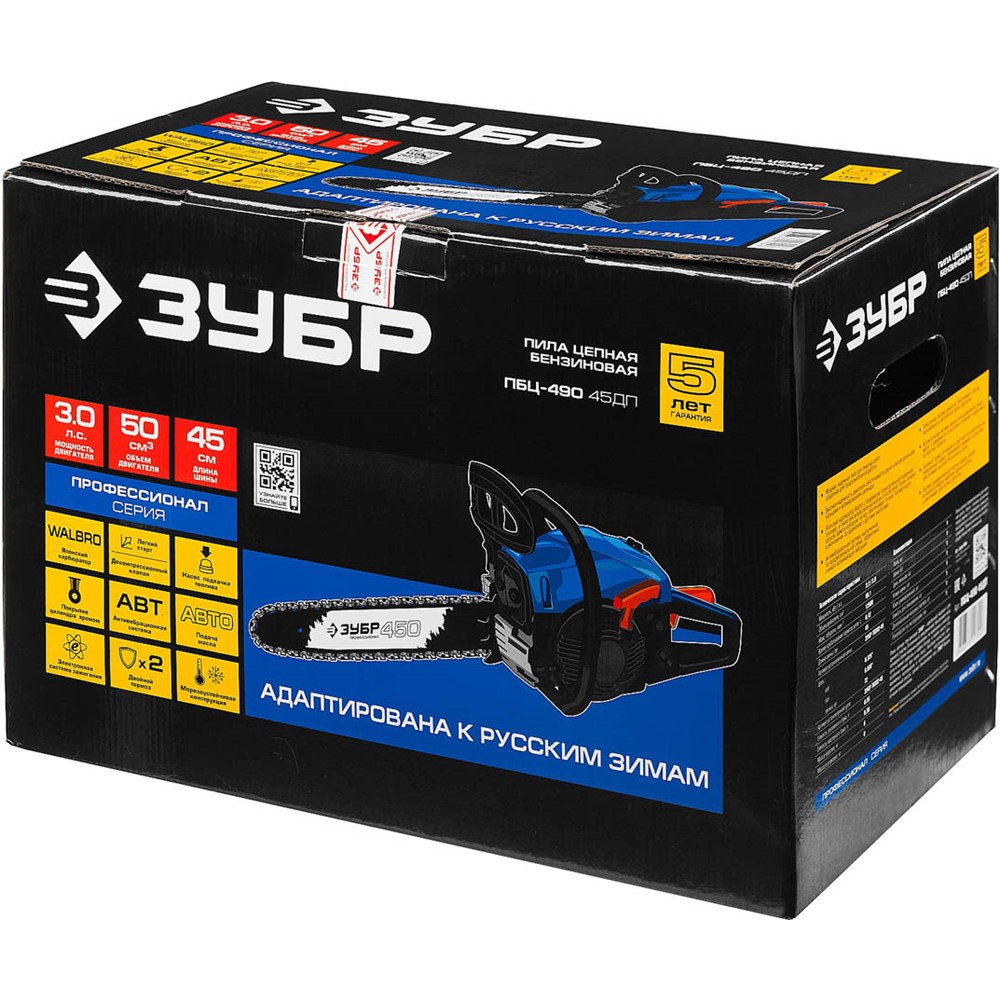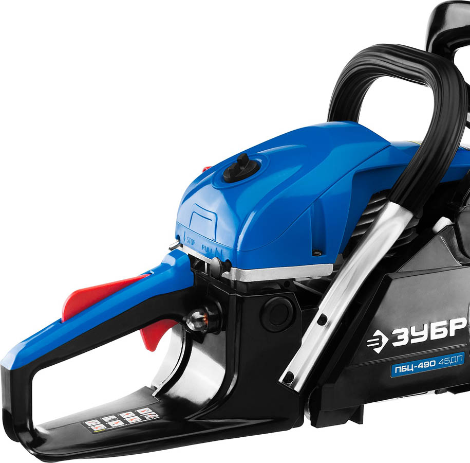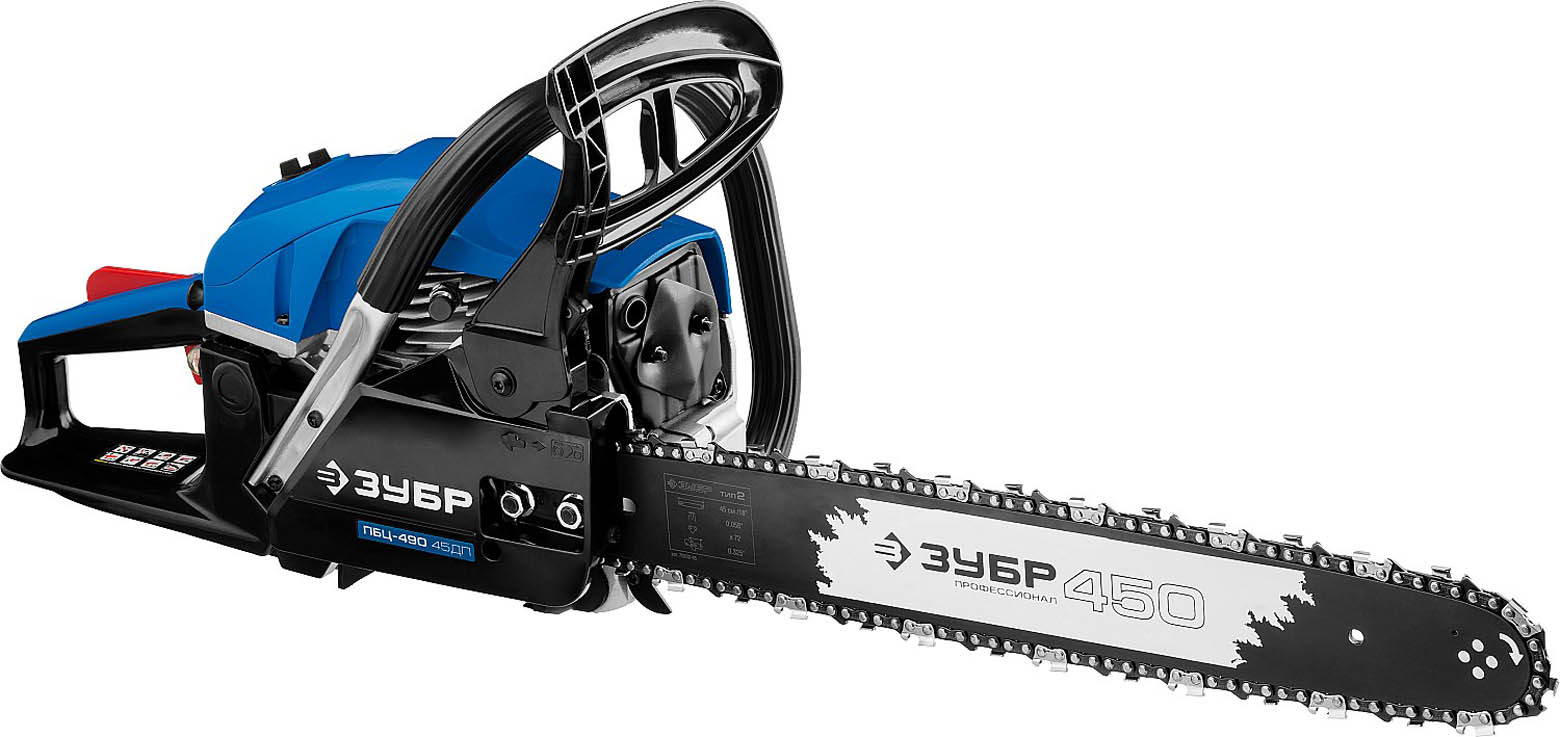 Пила цепная бензиновая ЗУБР ПБЦ-490 45ДП, предназначена для пиления досок, бруса, стволов различных пород дерева (с приводом режущего инструмента от двигателя внутреннего сгорания). Изделие предназначено для эксплуатации только вне помещений. Мощная, надежная пила для тяжелых работ, созданная для продолжительной работы. Высокая надежность двигателя обеспечивается двумя компрессионными кольцами и хромированием цилиндра. Японский карбюратор Walbro с праймером (принудительной подкачкой топлива) способствует более легкому запуску, даже в холодную погоду, обеспечивает точную топливоподачу и экономичен по сравнению с другими аналогами. Антивибрационная система, выполненная по профессиональной схеме, эффективно снижает возникающую вибрацию. Электронная система зажигания обеспечивает ровную, экономичную и экологичную работу двигателя. Автоматическая система смазки цепи дозированно подает масло, в зависимости от нагрузки и отключает подачу масло на холостых оборотах.