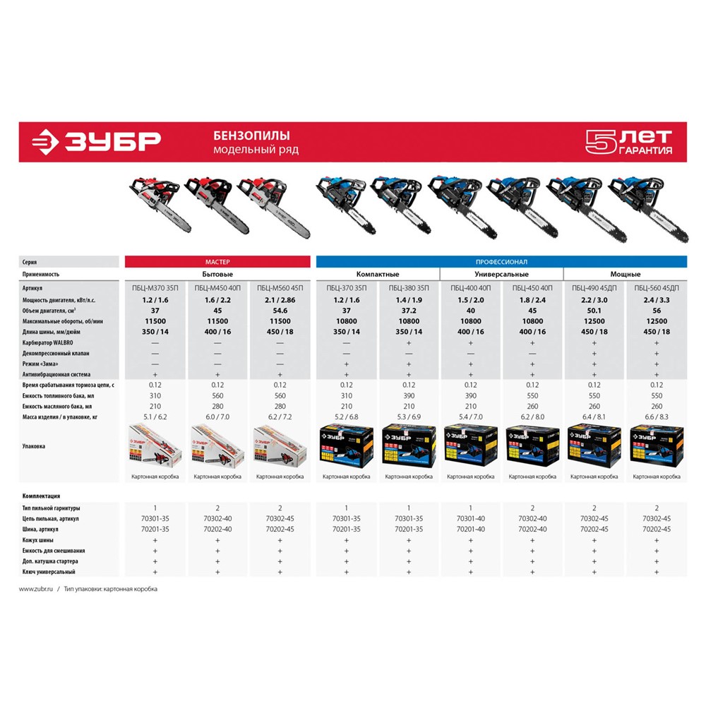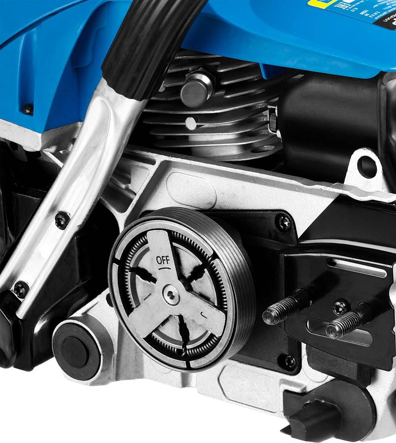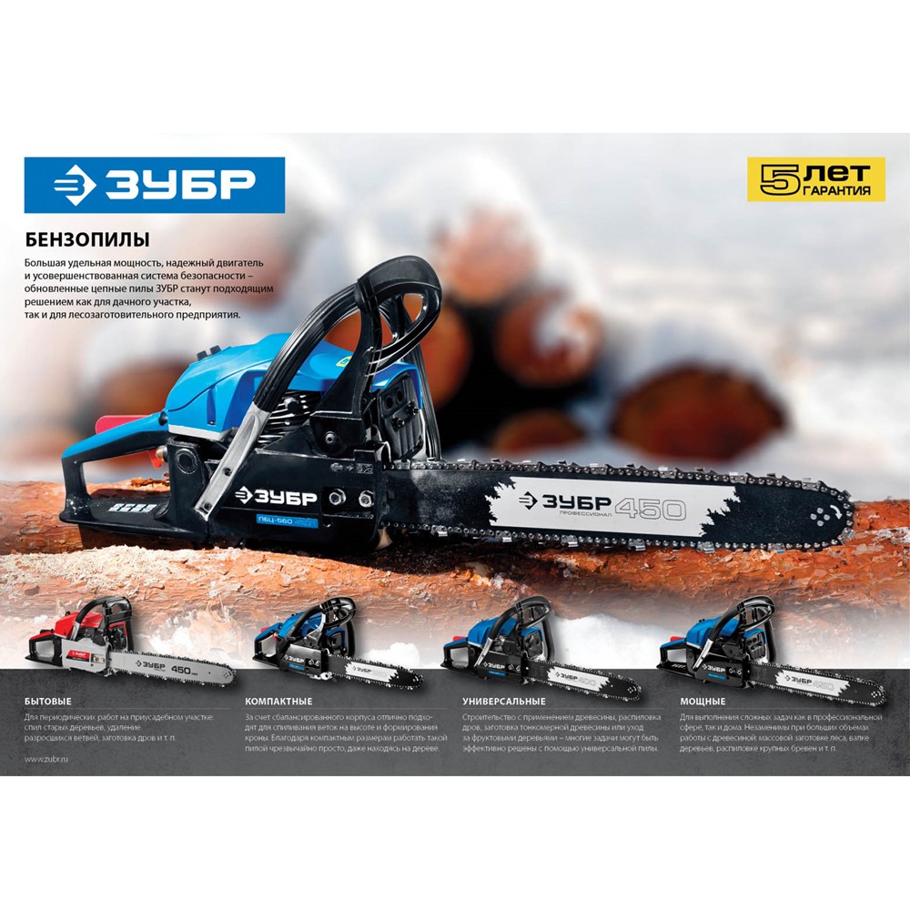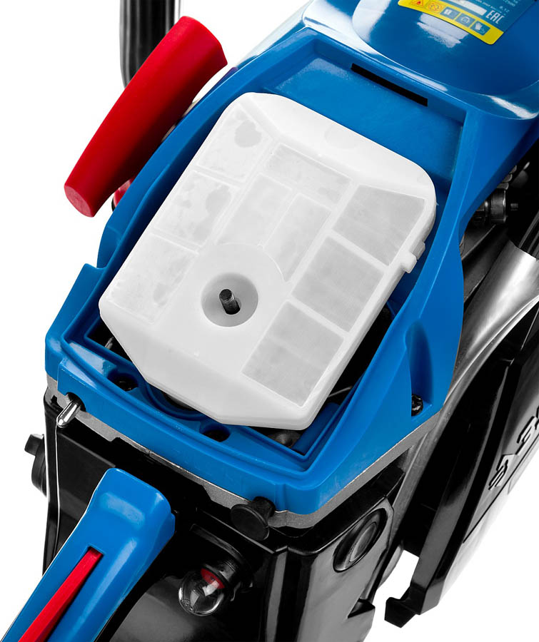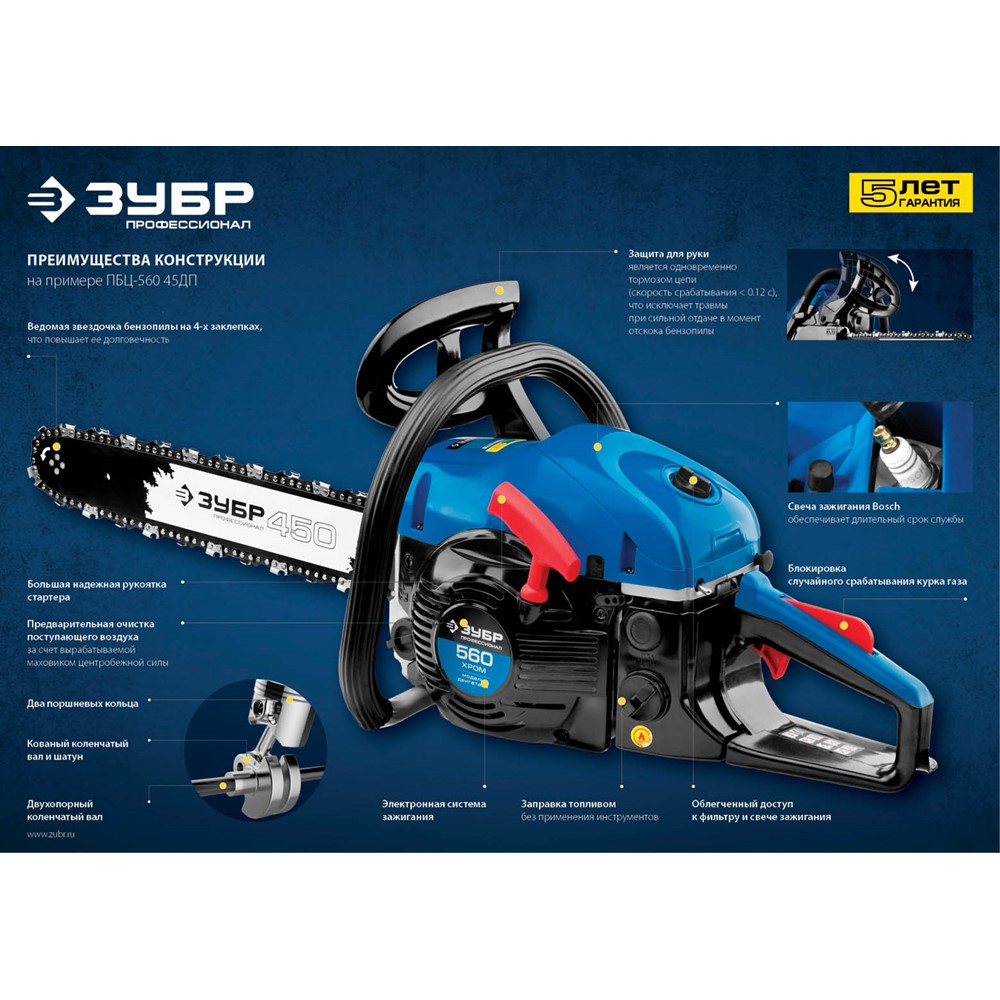 Пила цепная бензиновая ЗУБР ПБЦ-490 45ДП, предназначена для пиления досок, бруса, стволов различных пород дерева (с приводом режущего инструмента от двигателя внутреннего сгорания). Изделие предназначено для эксплуатации только вне помещений. Мощная, надежная пила для тяжелых работ, созданная для продолжительной работы. Высокая надежность двигателя обеспечивается двумя компрессионными кольцами и хромированием цилиндра. Японский карбюратор Walbro с праймером (принудительной подкачкой топлива) способствует более легкому запуску, даже в холодную погоду, обеспечивает точную топливоподачу и экономичен по сравнению с другими аналогами. Антивибрационная система, выполненная по профессиональной схеме, эффективно снижает возникающую вибрацию. Электронная система зажигания обеспечивает ровную, экономичную и экологичную работу двигателя. Автоматическая система смазки цепи дозированно подает масло, в зависимости от нагрузки и отключает подачу масло на холостых оборотах.