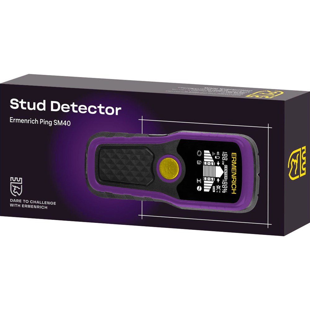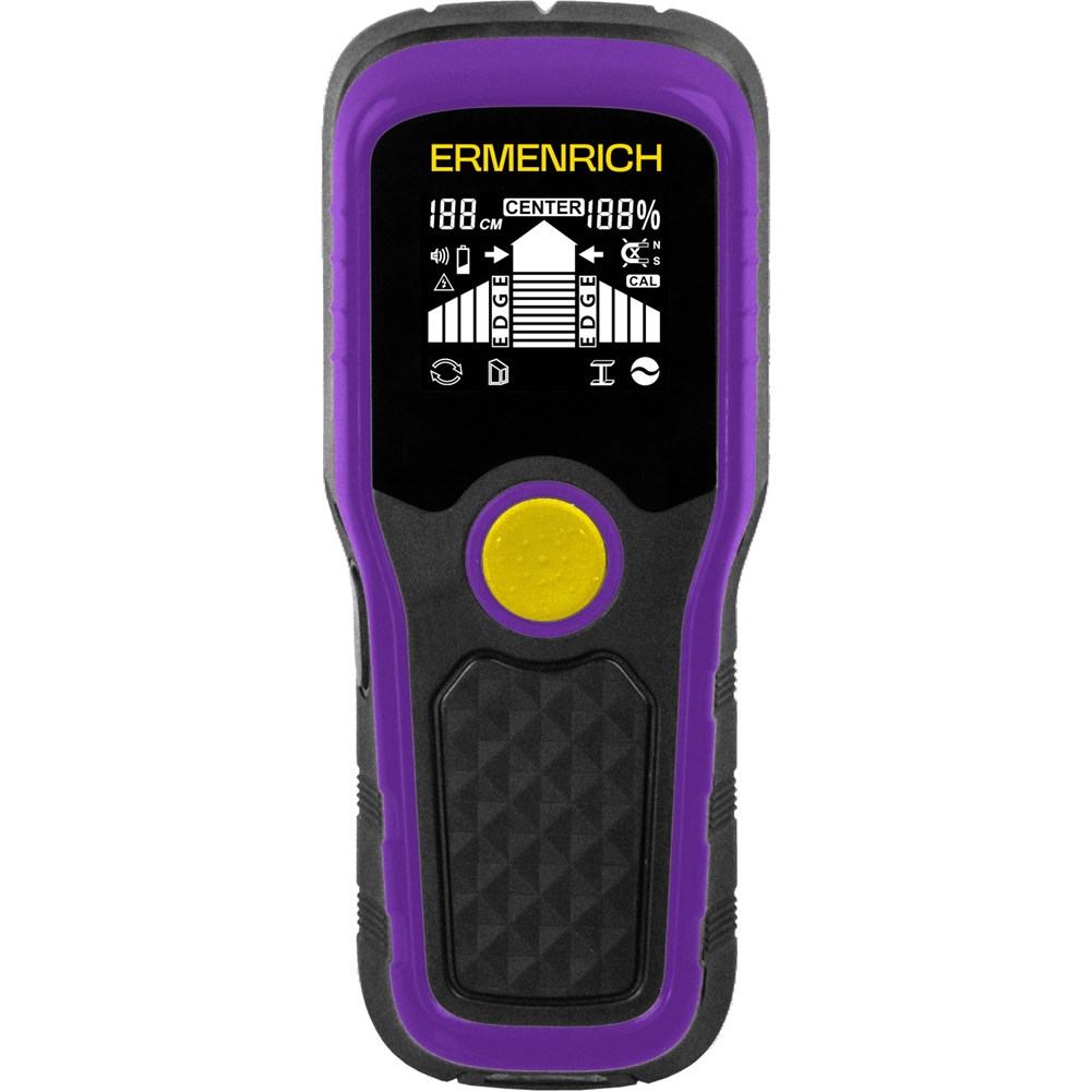 Ermenrich Ping SM40 – компактный детектор скрытых коммуникаций, сочетающий удобство бытового прибора с точностью профессионального инструмента. Устройство за считаные секунды различает древесину, металл и активные кабели, сразу выводя достоверные данные на контрастный ЖК-экран. Особенность модели – автоматический выбор режима работы, благодаря чему не нужно вручную подбирать нужный, все управление осуществляется всего одной кнопкой. Во время работы прибор автоматически определяет самый сильный сигнал, а на дисплее отображается значок соответствующего режима обнаружения.