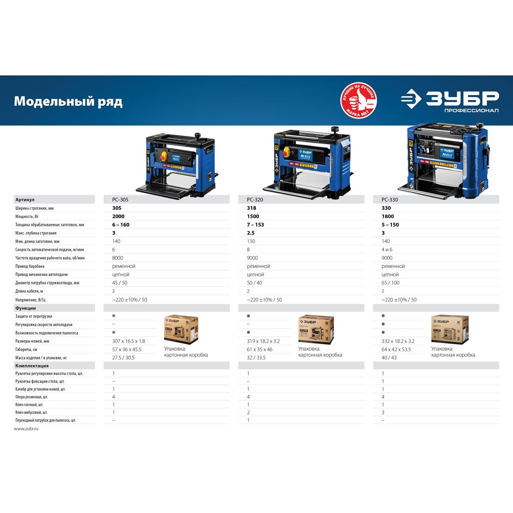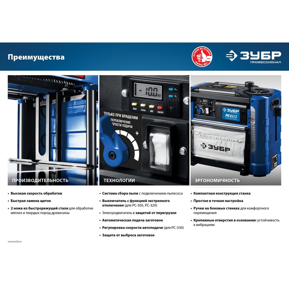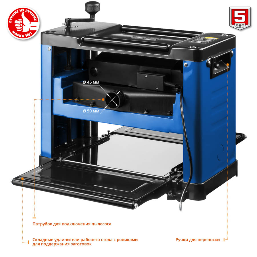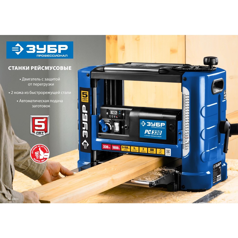 Рейсмусовый станок ЗУБР РС-305, продольного одностороннего строгания в размер по толщине плоских заготовок из древесины. Мощный двигатель с защитой от перегрузки и удлинители рабочего стола для точной установки толщины строгания позволяют выполнить работу не только быстро, но и точно. Компактный переносной станок с возможностью обработки заготовок шириной до 305 мм. Мощный двигатель с защитой от перегрузки. Два ножа из быстрорежущей стали. Удлинители стола с роликами облегчают подачу заготовки и поддерживают её на входе и выходе. Ролики на верхней части станка упрощают возврат заготовки при необходимости повторного строгания. Жесткая конструкция. Идеально гладкая поверхность стола уменьшает трение при подаче заготовки. Удобные ручки для переноски станка.