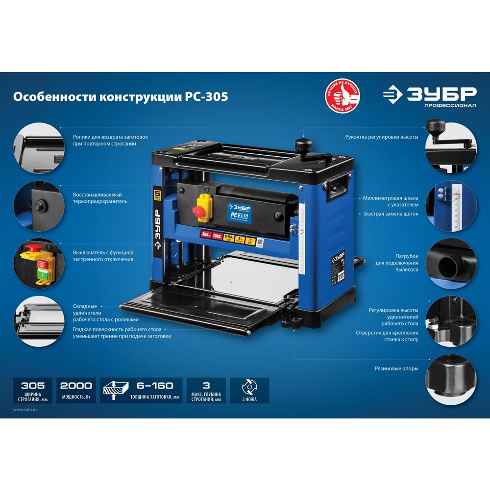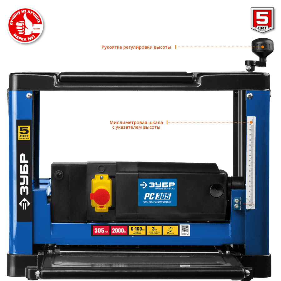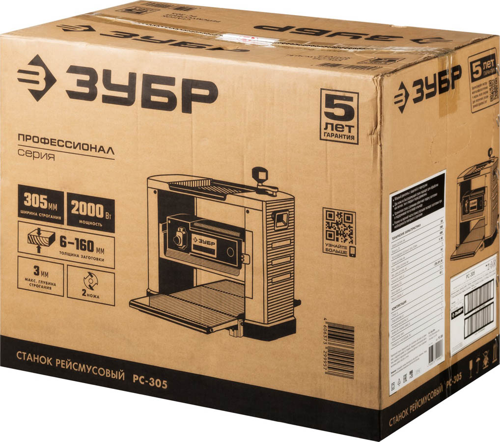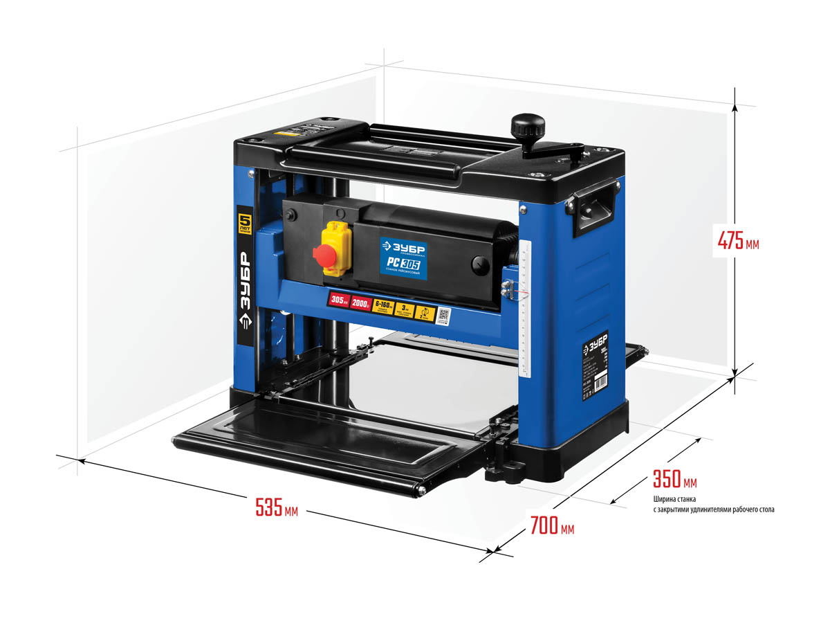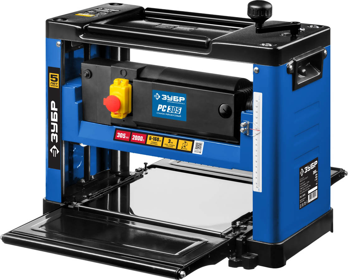 Рейсмусовый станок, ЗУБР РС-305, ширина строгания 305мм, толщина заготовки до 160 мм, 2 ножа, 8000 об/мин, 2000Вт, 6м/мин