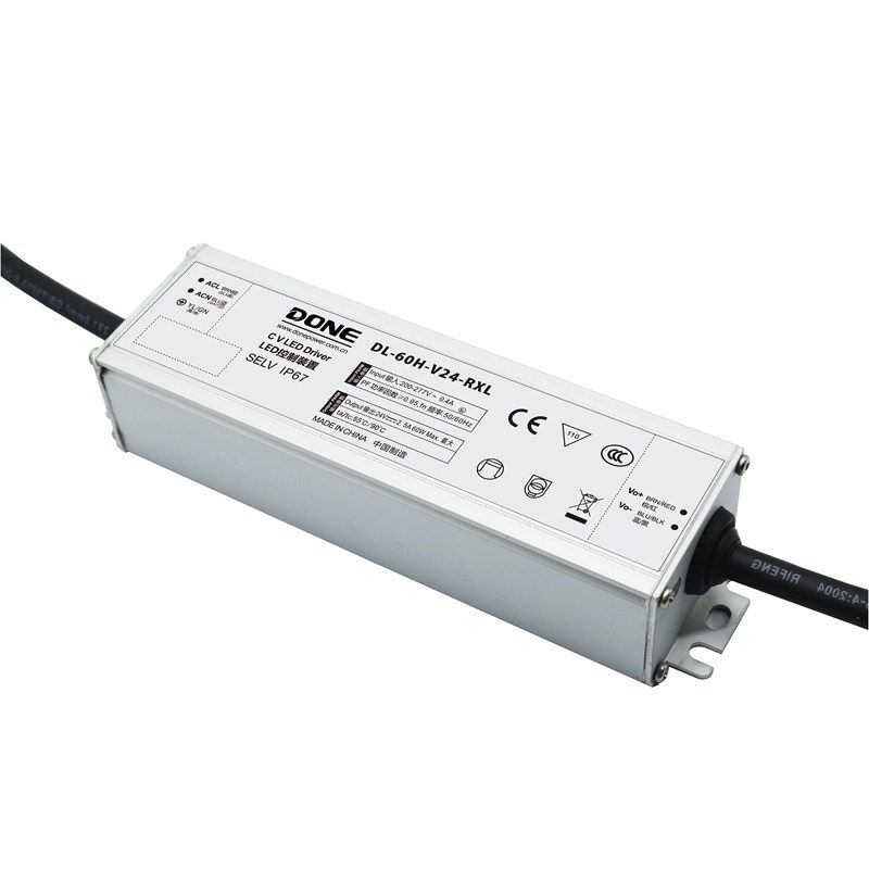 Водонепроницаемый, источник питания в узком корпусе со степенью защиты IP67 серии RXL с функцией стабилизации напряжения работает в диапазоне входного напряжения 176–305 В переменного тока.