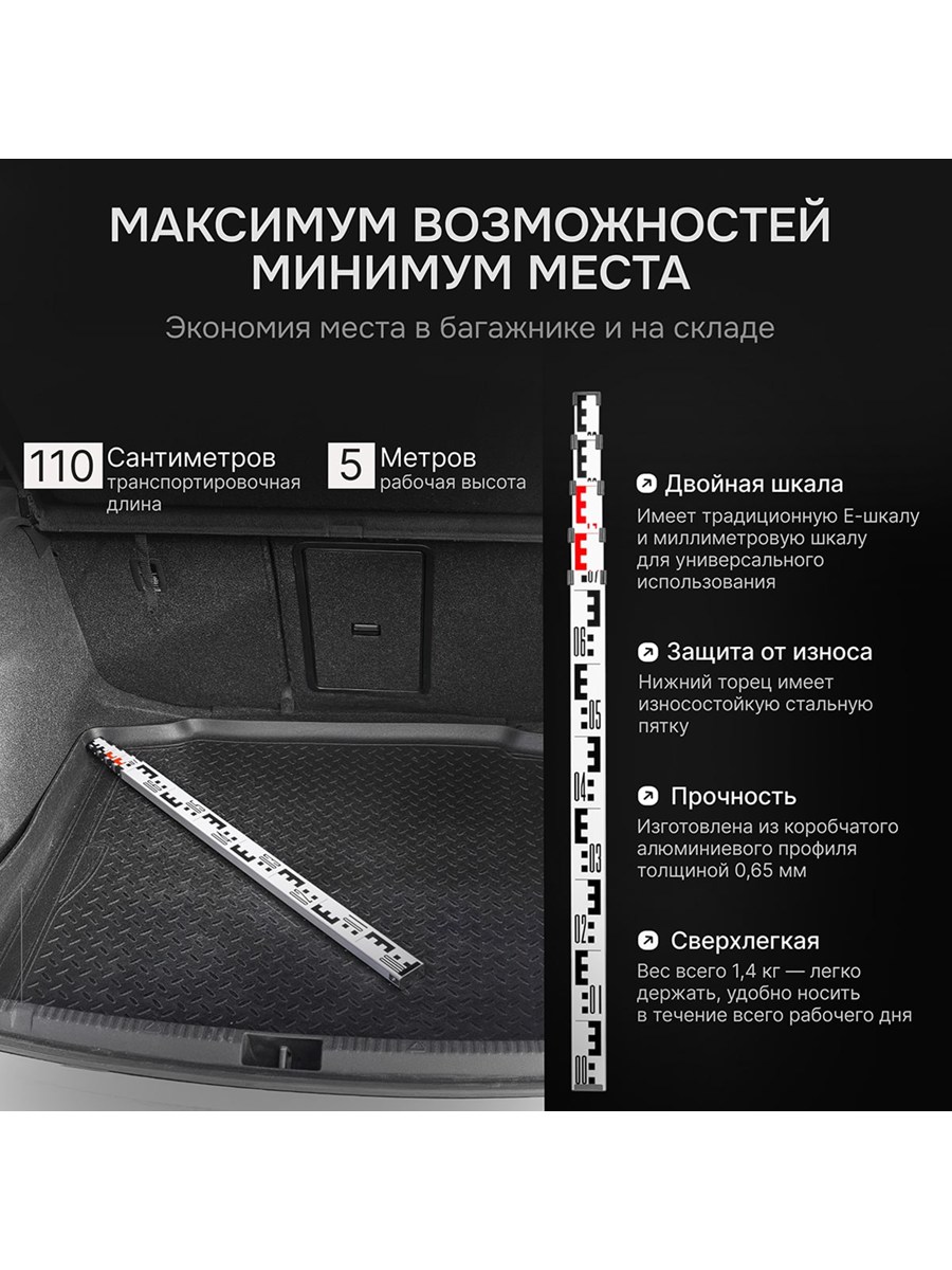 - Мобильность – При значительной длине в рабочем положении, позволяющей выполнять измерения превышений при больших перепадах высот, в сложенном состоянии модель занимает мало места, легко помещаясь в багажнике.