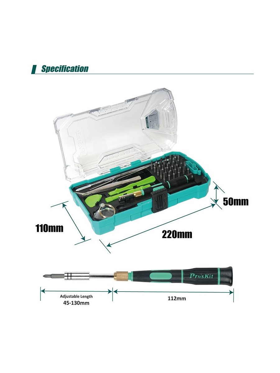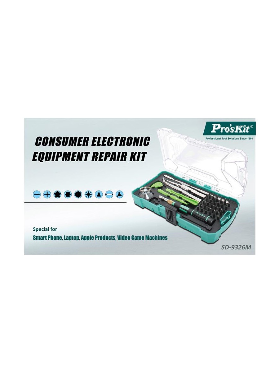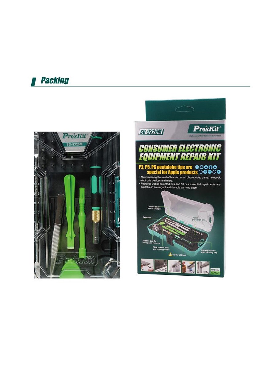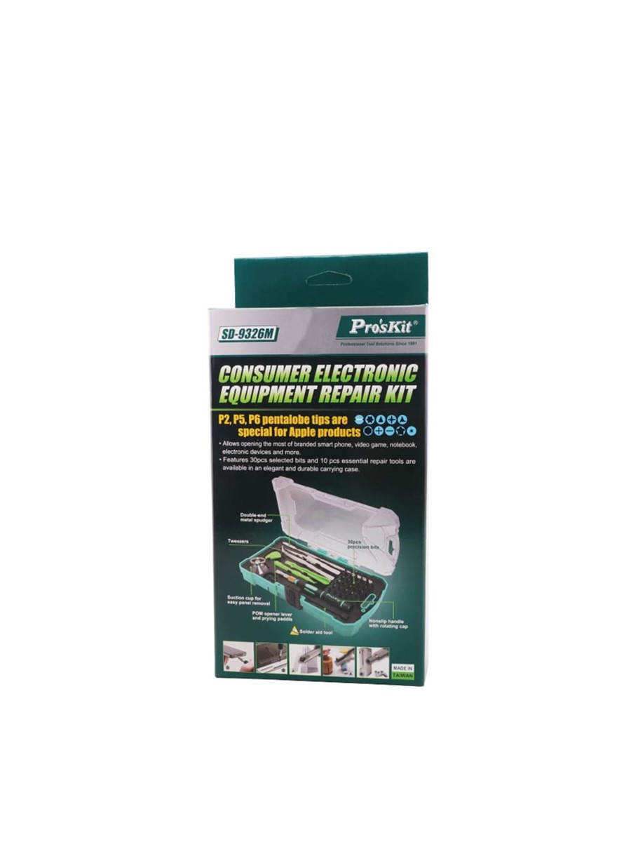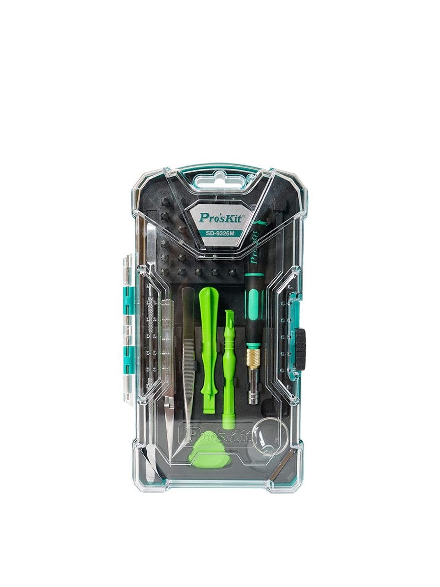 Набор Pro'sKit SD-9326M состоит уз 30 прецизионных бит с отверткой и 10 основных инструментов для разборки телефонов, игровых консолей, ноутбуков и других устройств. Набор подходит для разборки Apple iPhone 4, 4S, 5, 5C, 5S, 6, 6 Plus, MacBook Air и MacBook Pro. В набор включена присоска, пинцет, металлический спаджер и лопатка.