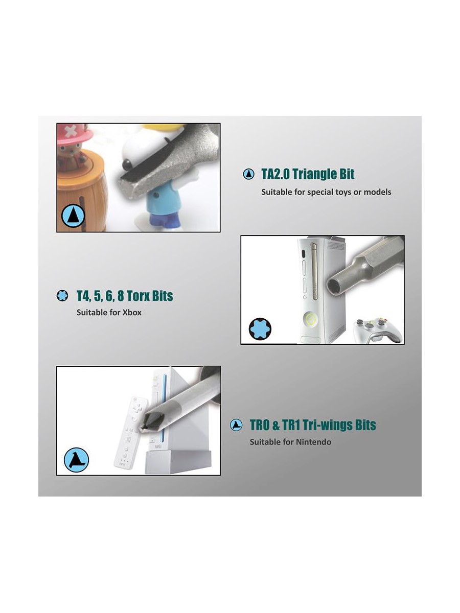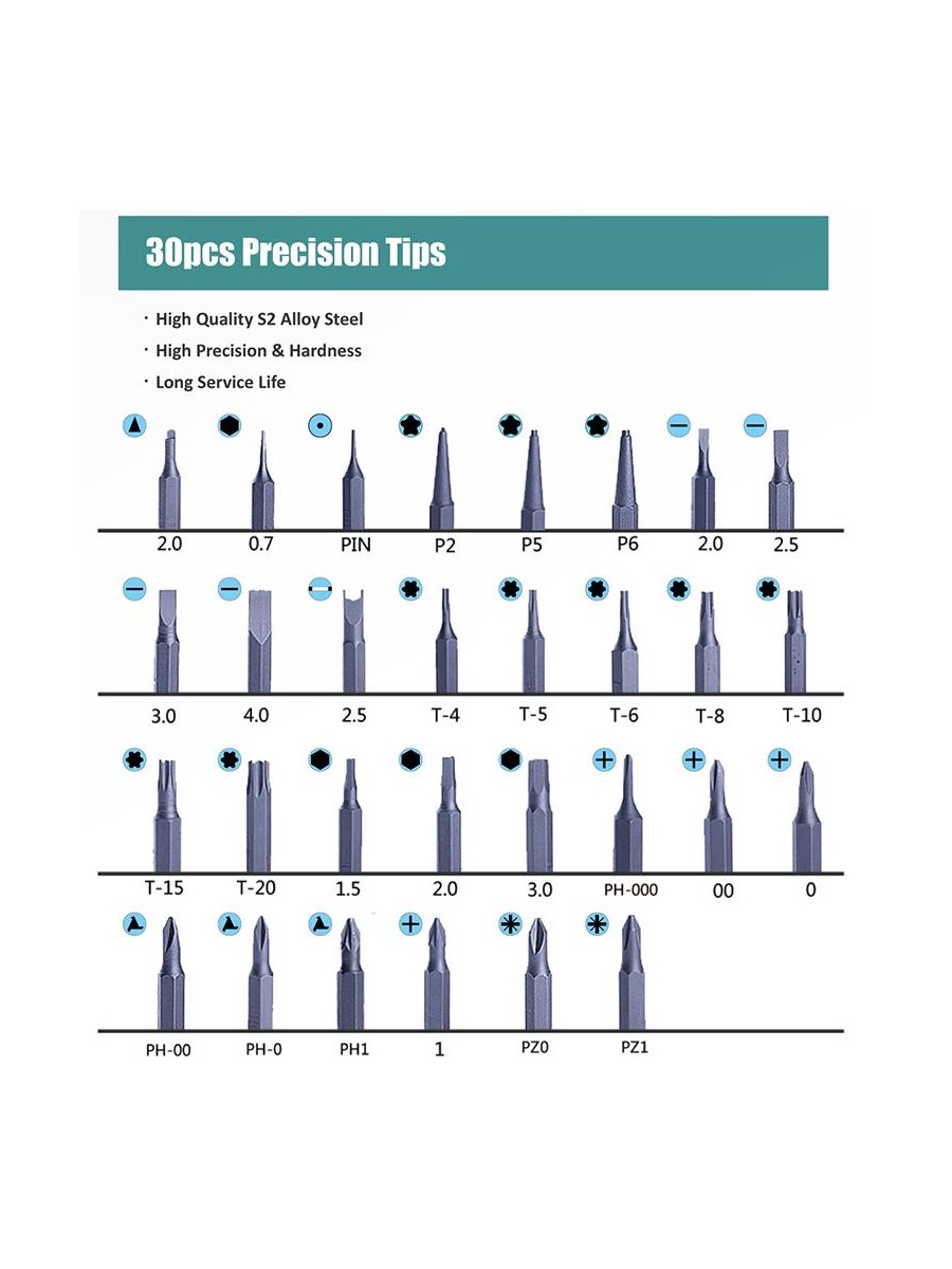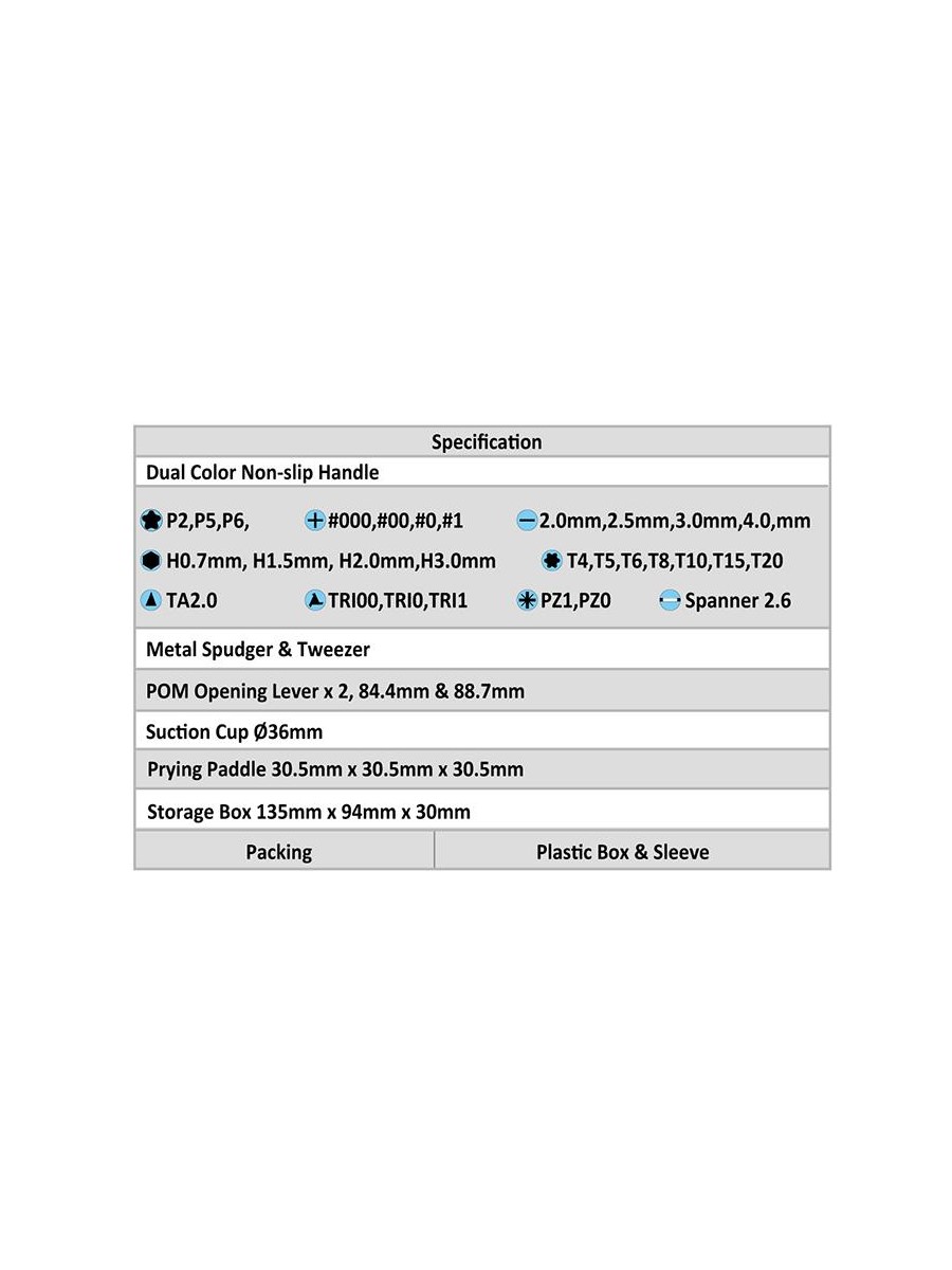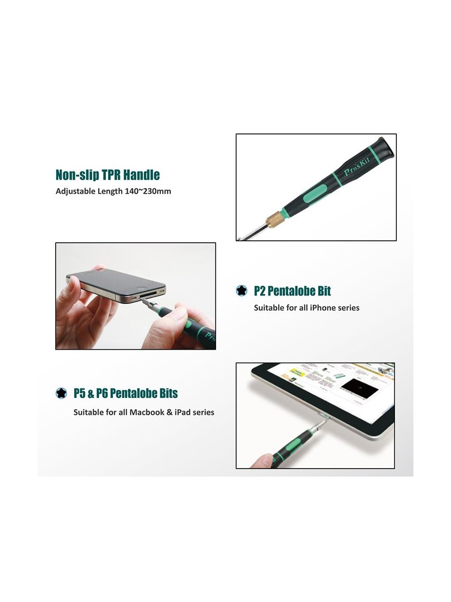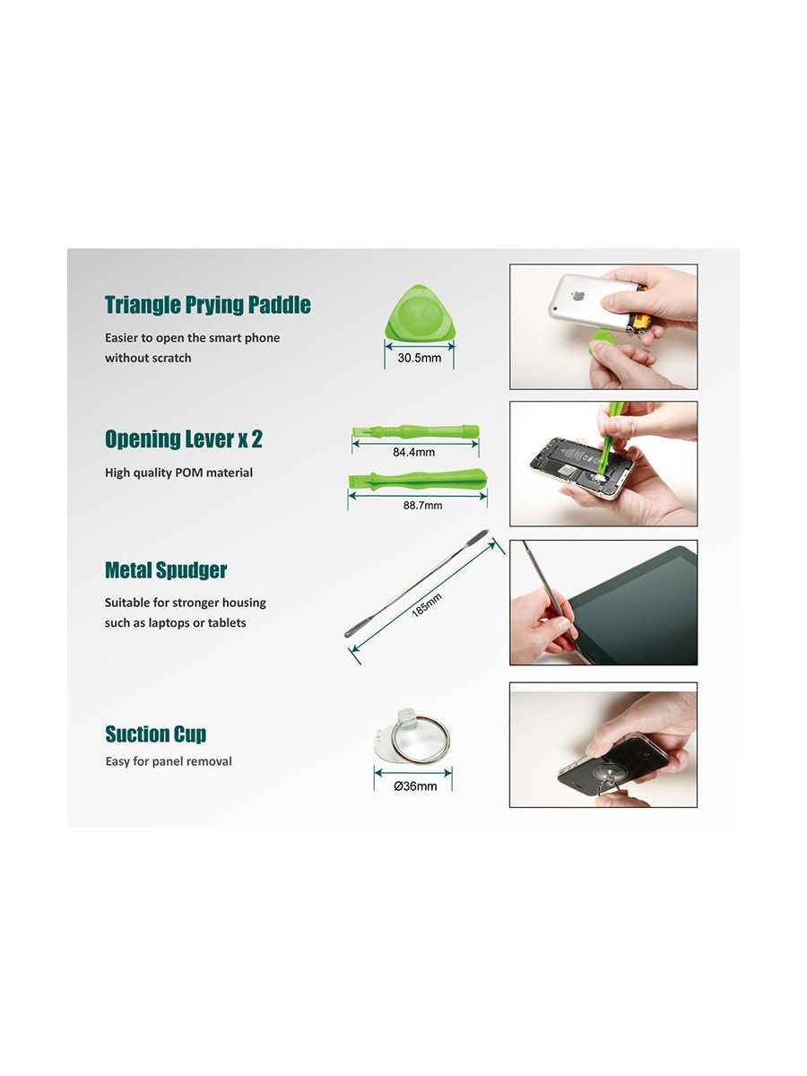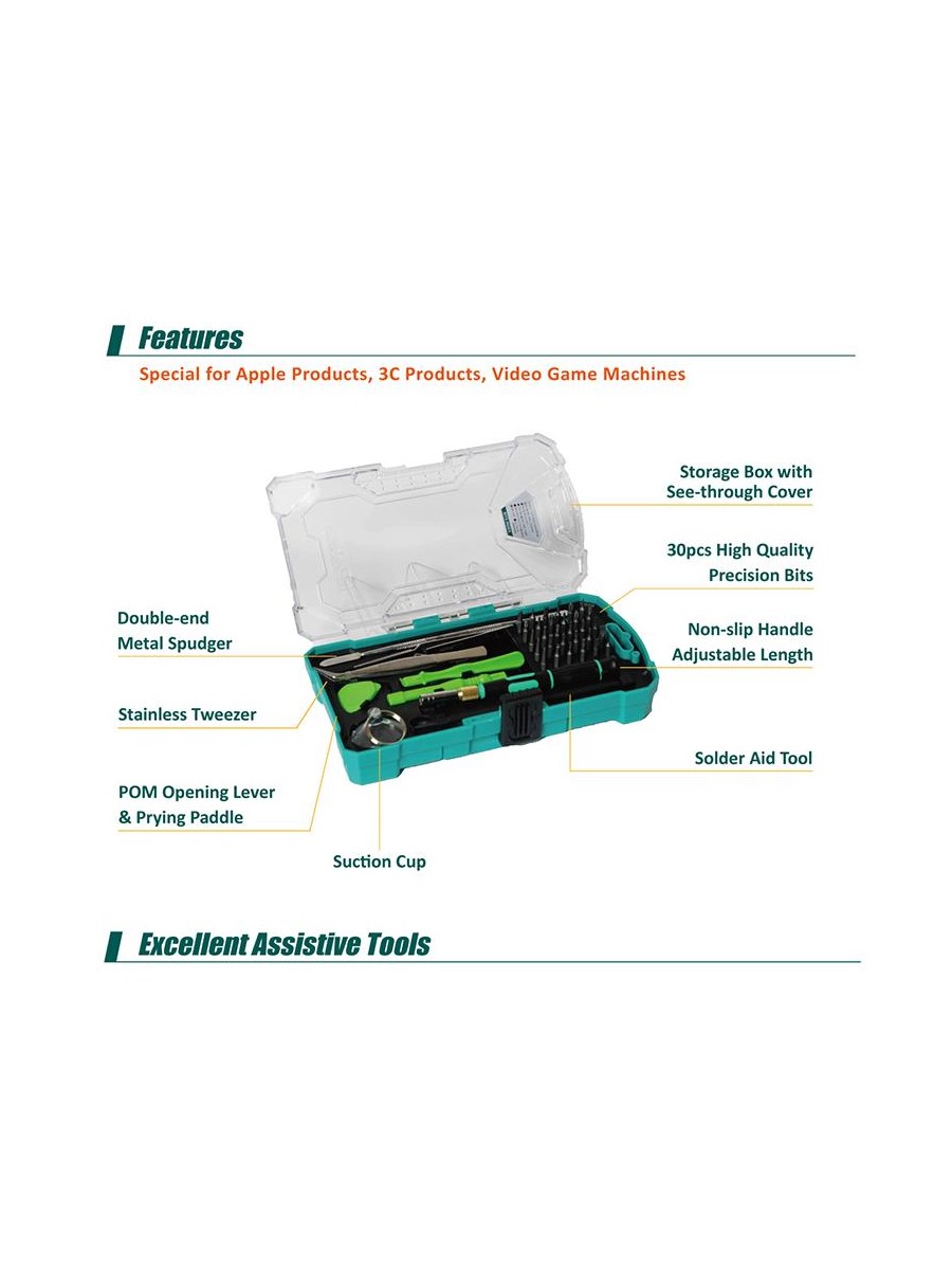 Набор Pro'sKit SD-9326M состоит уз 30 прецизионных бит с отверткой и 10 основных инструментов для разборки телефонов, игровых консолей, ноутбуков и других устройств. Набор подходит для разборки Apple iPhone 4, 4S, 5, 5C, 5S, 6, 6 Plus, MacBook Air и MacBook Pro. В набор включена присоска, пинцет, металлический спаджер и лопатка.