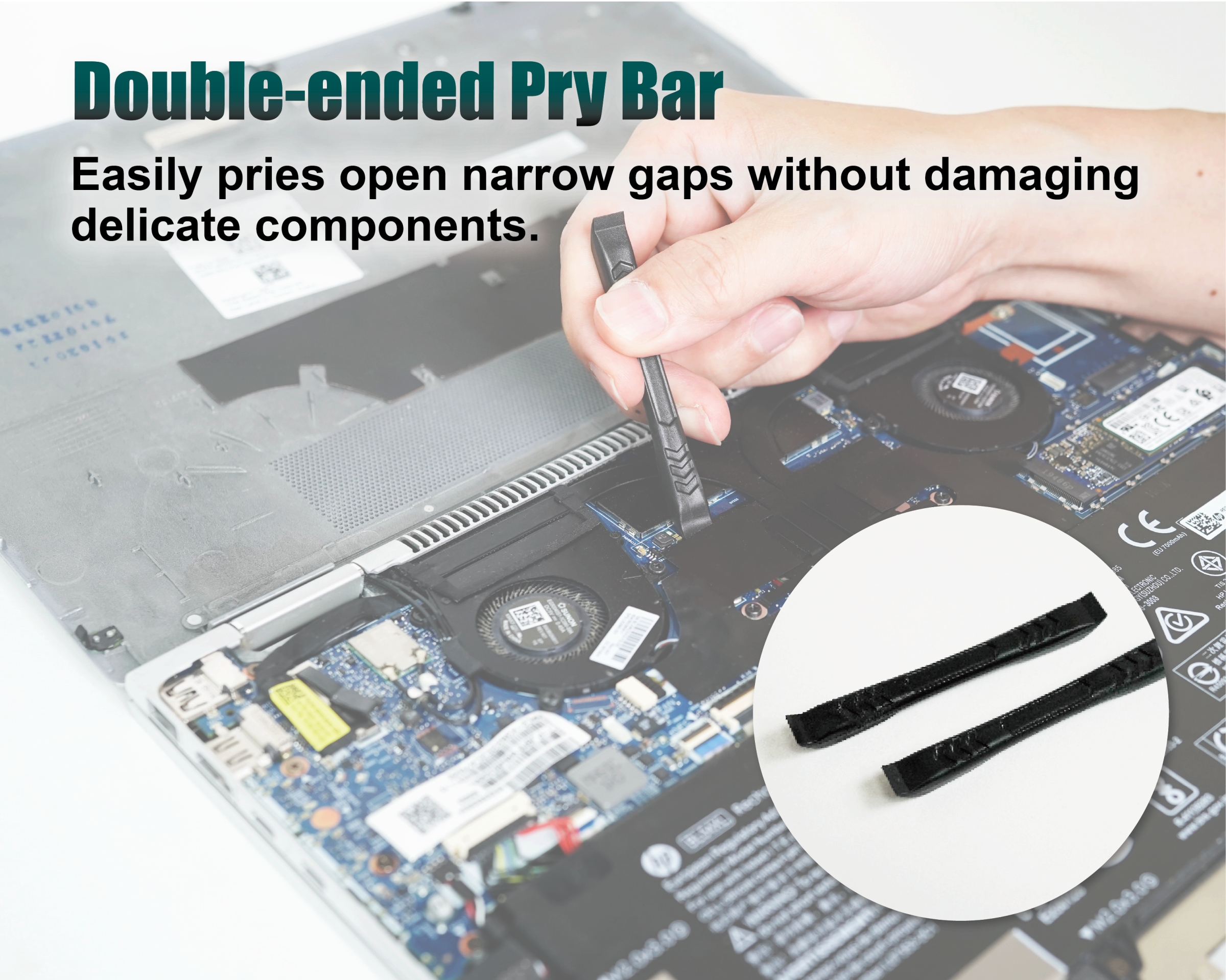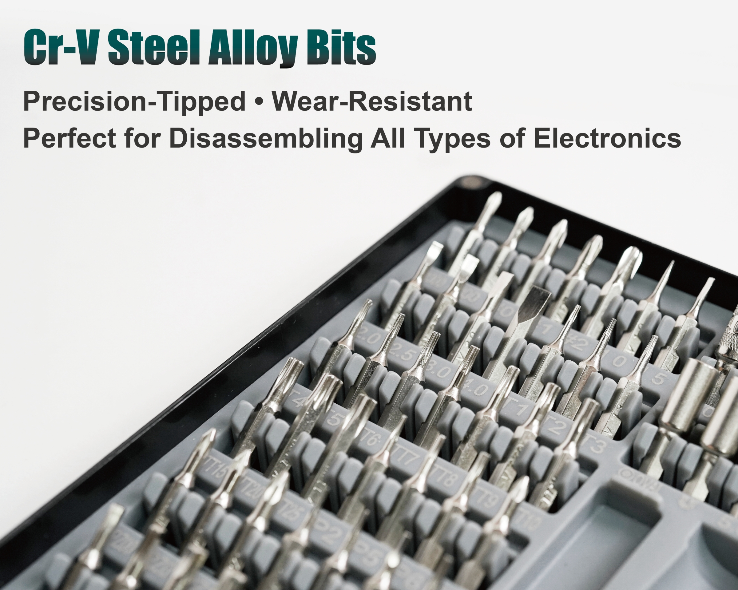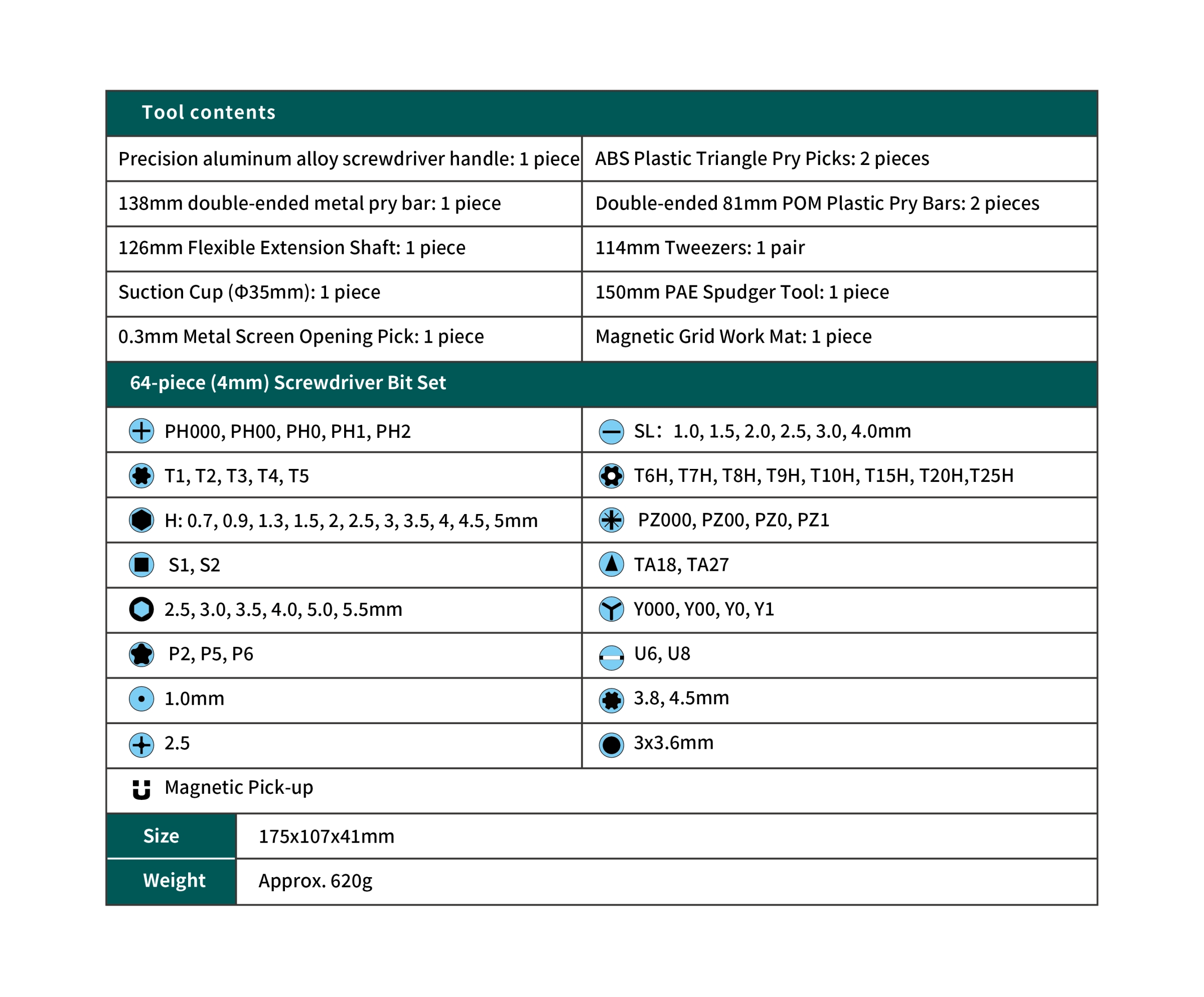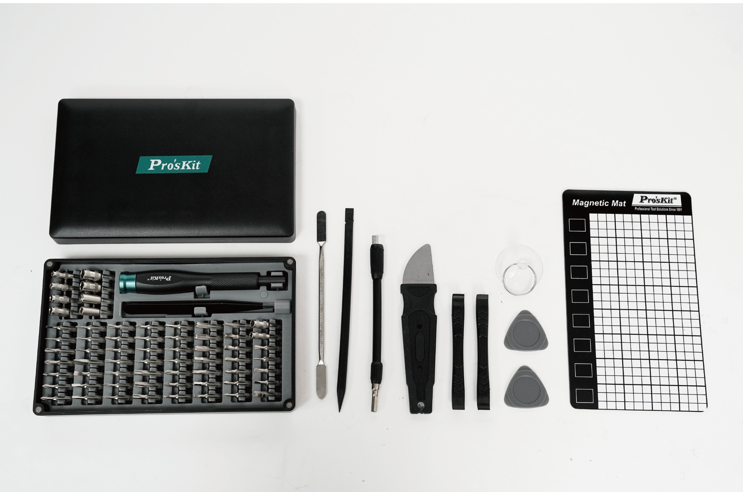 Включает 76 инструментов: 64 прецизионные биты, пластиковые и металлические инструменты для снятия экрана, инструмент для вскрытия экрана, прецизионный пинцет, магнитную накладку и многое другое — для широкого спектра ремонтных работ.