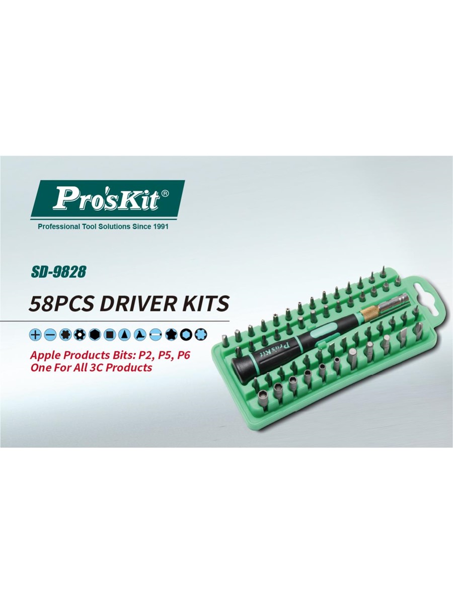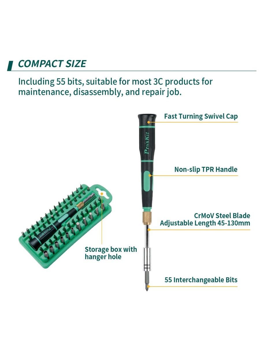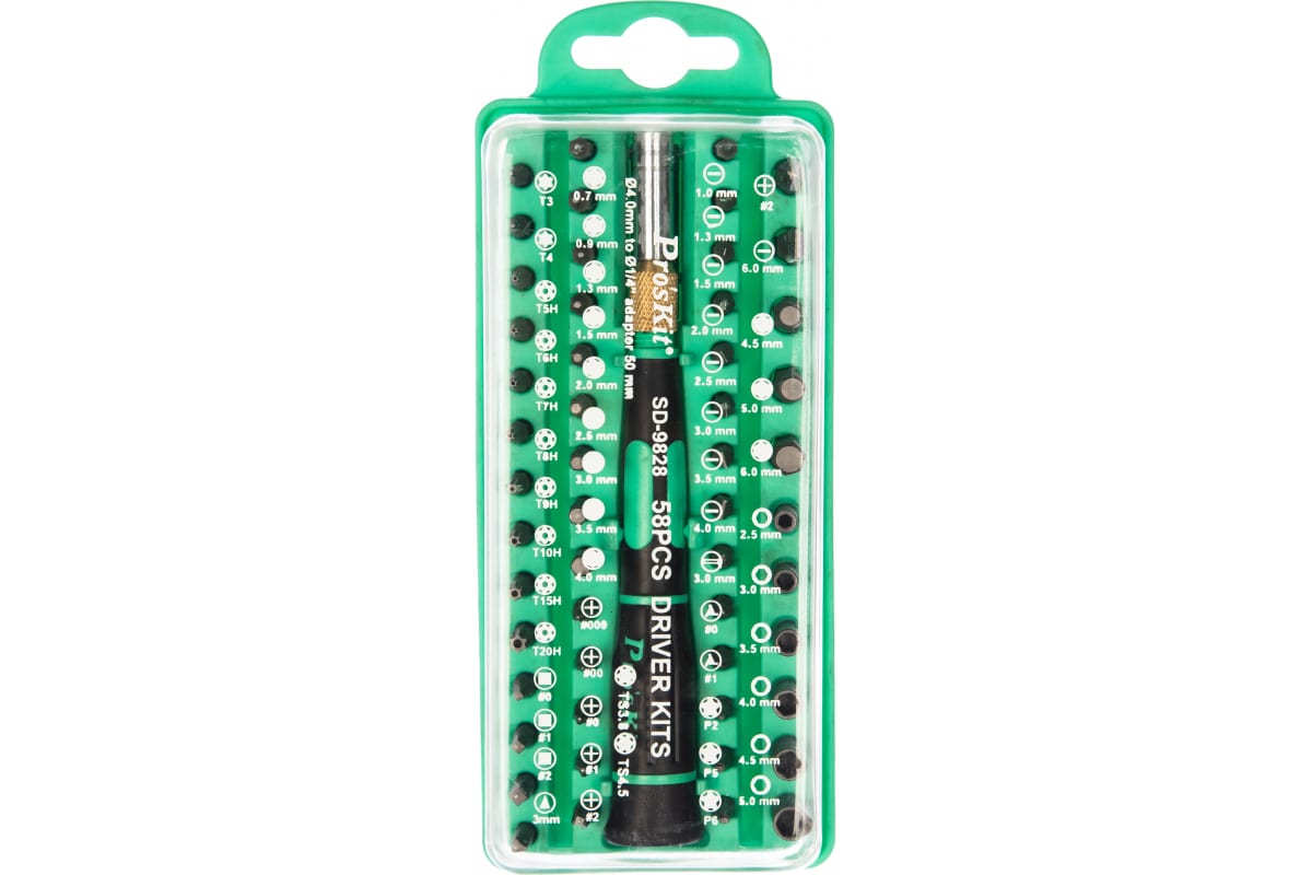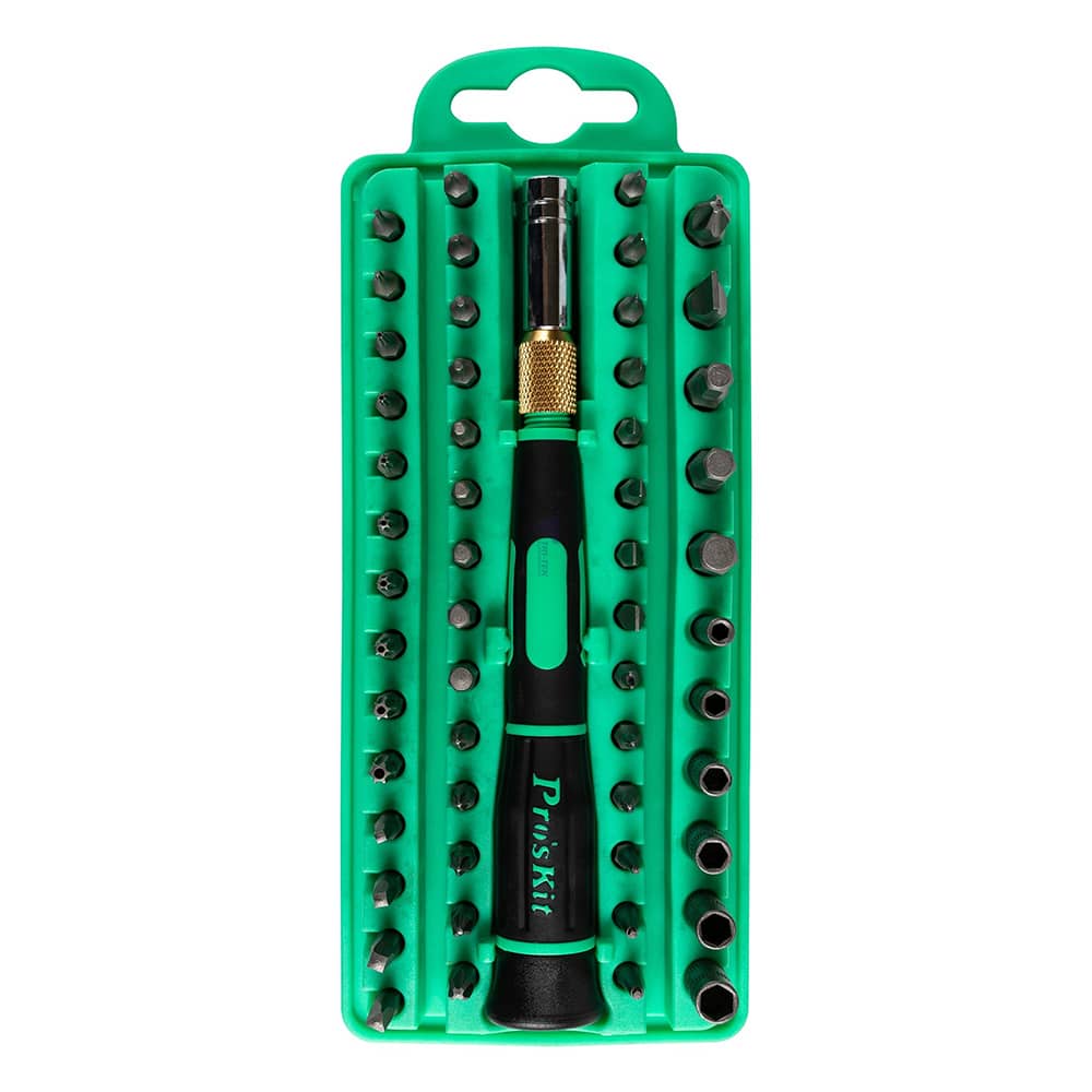 Набор отверток ProsKit SD-9828 включает в себя 55 различных наконечников, что позволяет эффективно работать с классическим и нестандартным крепежом.