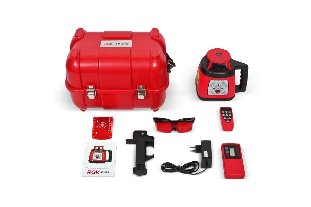 Лазерный уровень RGK SP310 поставляется с расширенным комплектом аксессуаров, повышающих функциональность инструмента. Благодаря приемнику лазерного излучения дальность работы нивелира может достигать 150 метров, что позволяет использовать прибор для работ на открытом воздухе. Пульт дистанционного управления позволяет осуществлять управление нивелиром на расстоянии. Специальный кронштейн позволяет установить приемник на рейку.