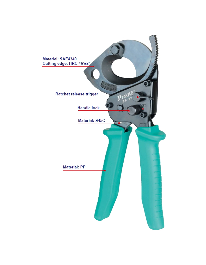 Изготовлен из высококачественной углеродистой стали S45C. Режущие кромки из легированной стали SAE4340 закалены до твердости 45°±2° HRC. Храповый механизм позволяет уменьшить усилия и обеспечить точность при резке. С кнопкой сброса для легкого возврата лезвия в исходное положение. Поставляется в картонной коробке.