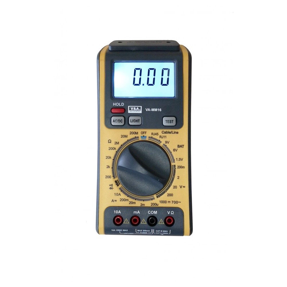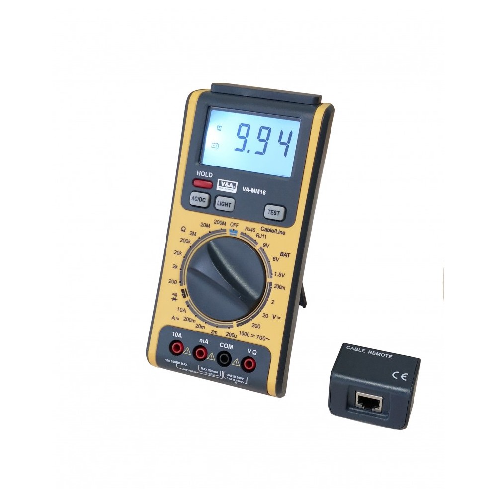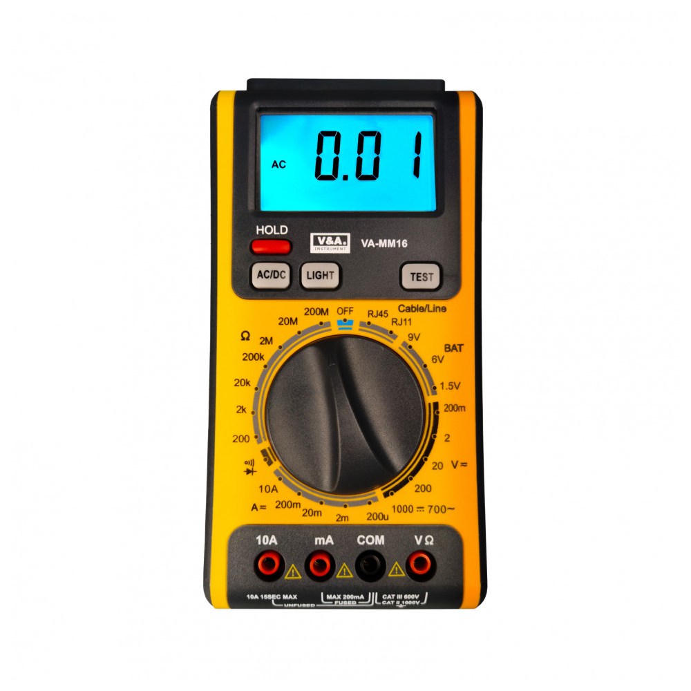 Особенность мультиметра VA-MM16: тестирование телефонных линий (RJ-11) и компьютерных сетей (RJ-45), стандарты T568A, T568B, 10Base-T, TokenRing Технические характеристики:
